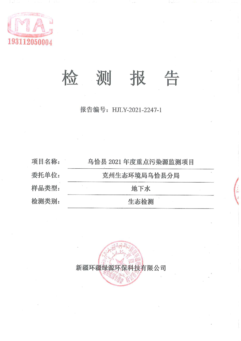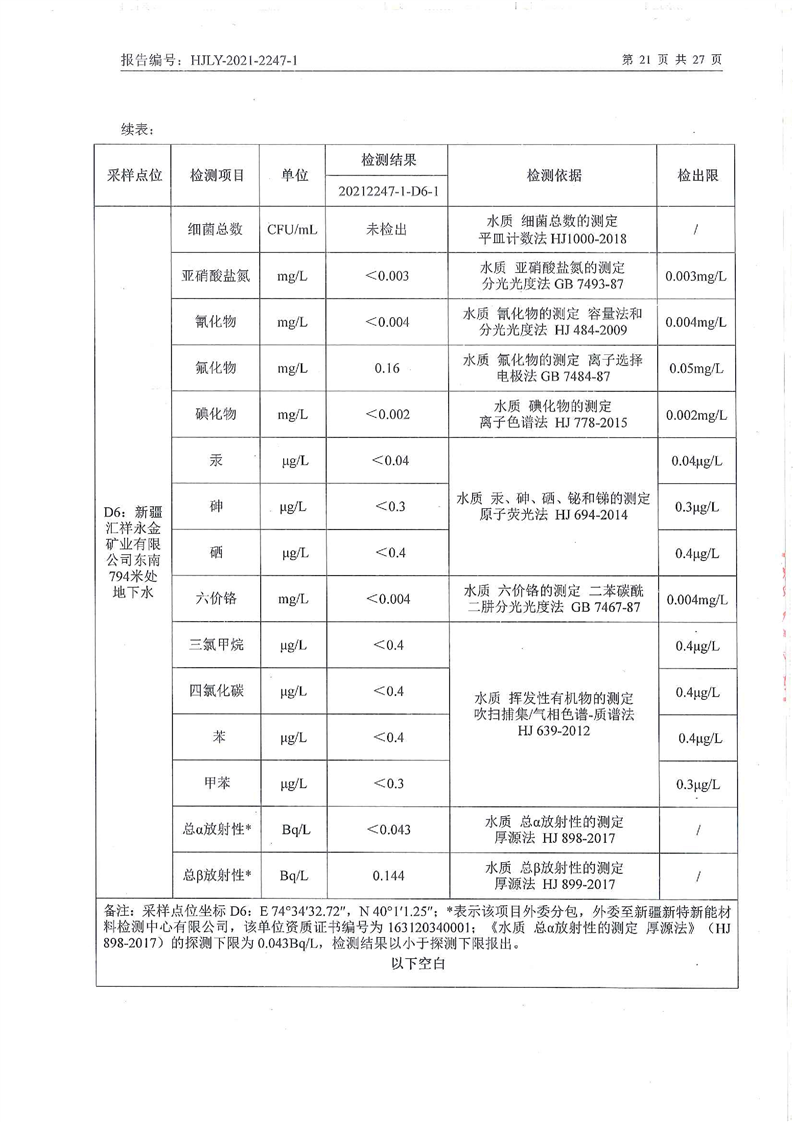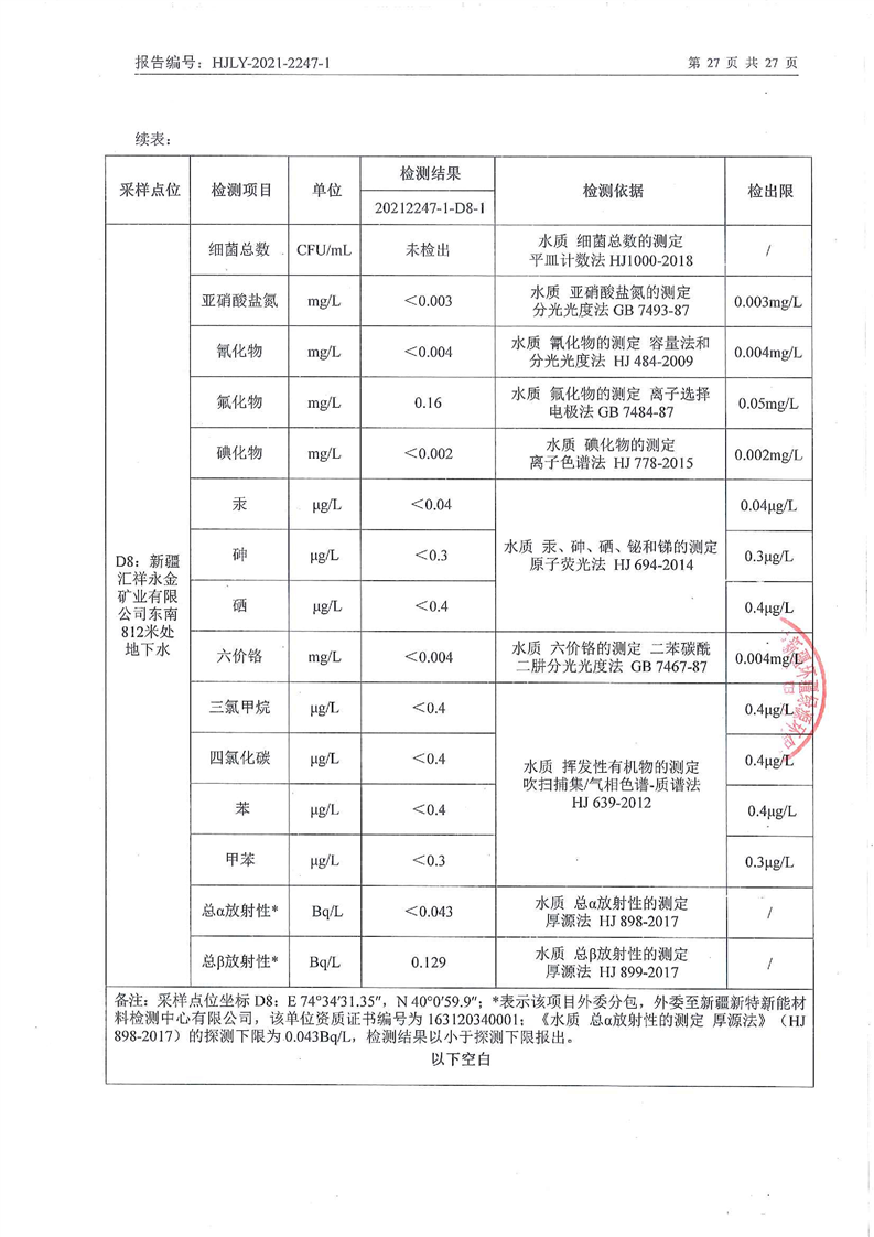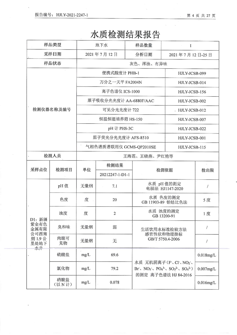 乌恰县紫金有色、汇祥永金有限公司地下水监测报告