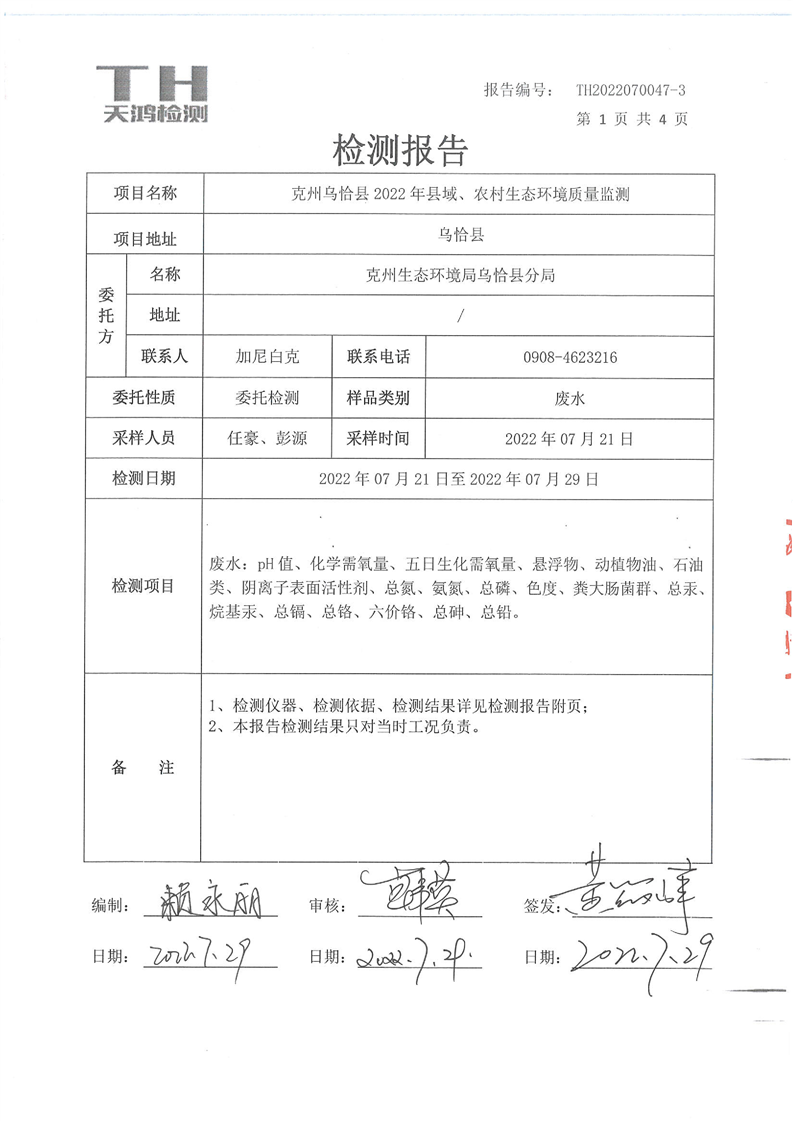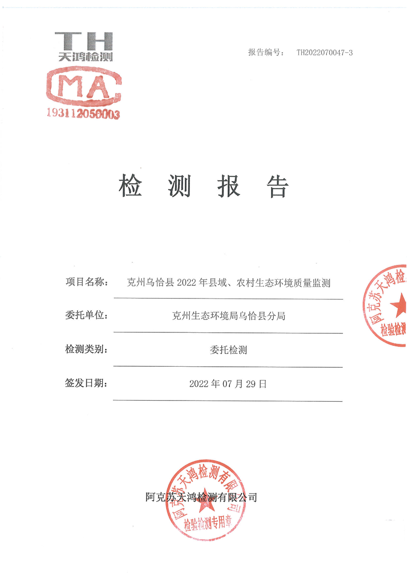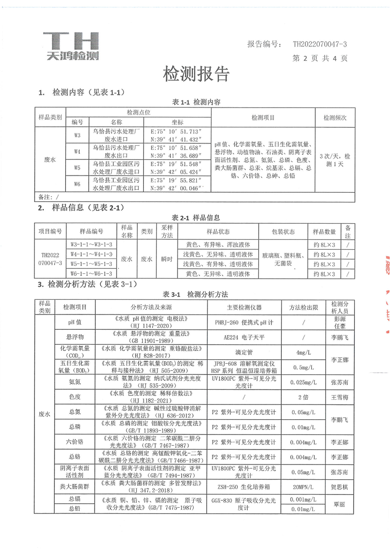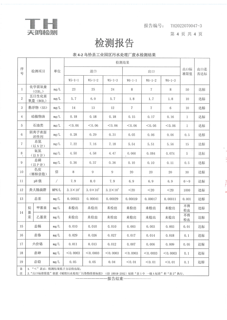 乌恰县和工业园区污水处理厂废水检测报告(第三季度)