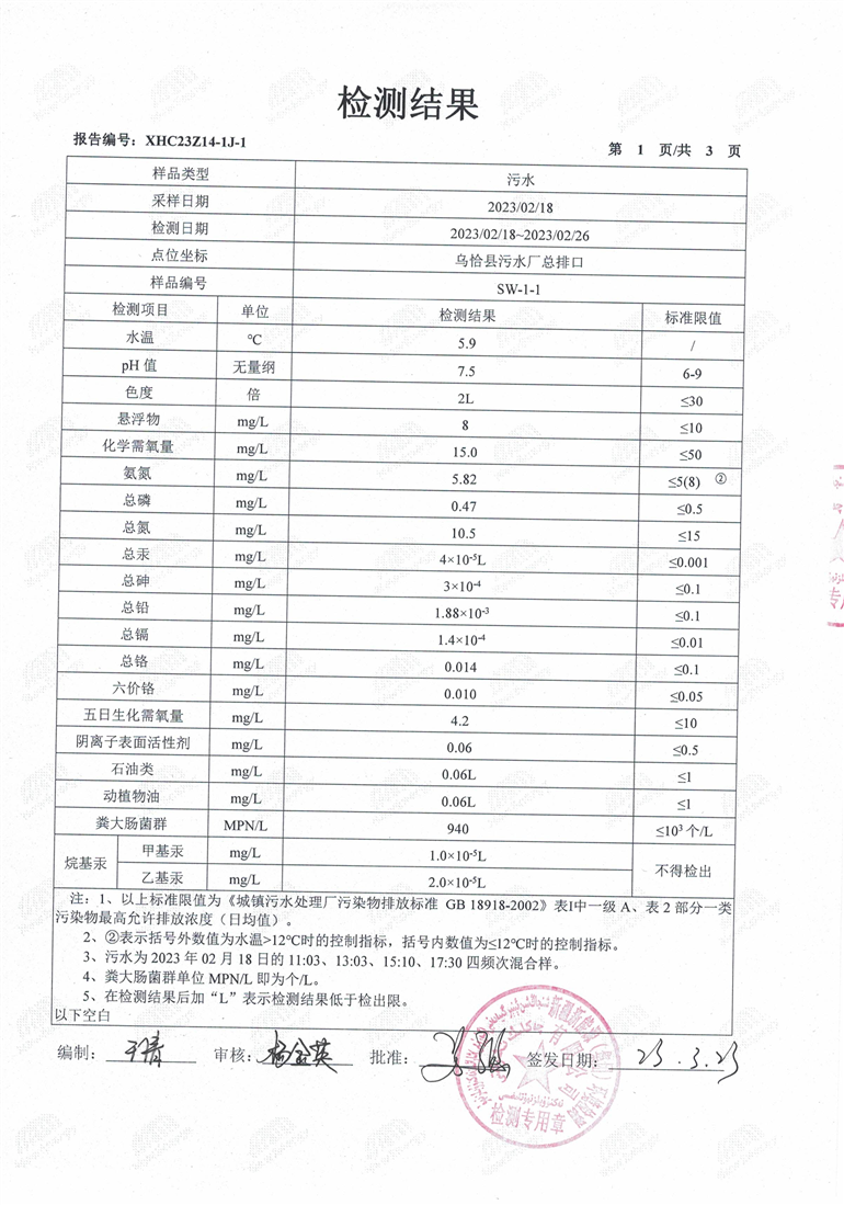 乌恰县第一季度污水处理厂污水检测报告