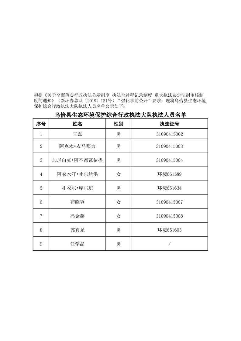 乌恰县生态环境保护综合行政执法大队执法人员名单