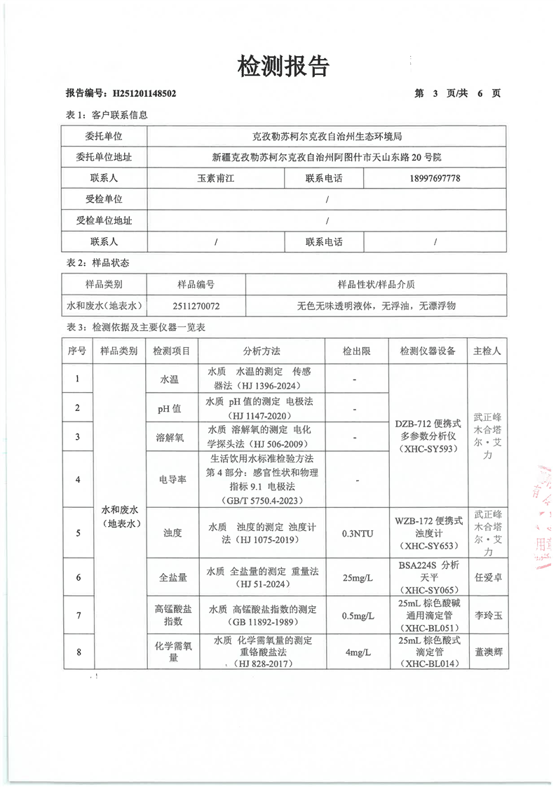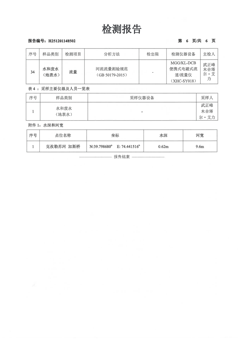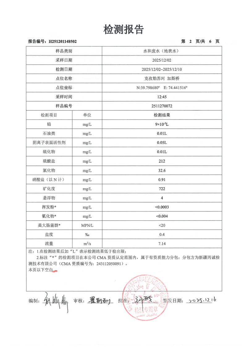 克孜勒苏河加斯桥断面地表水12月检测报告