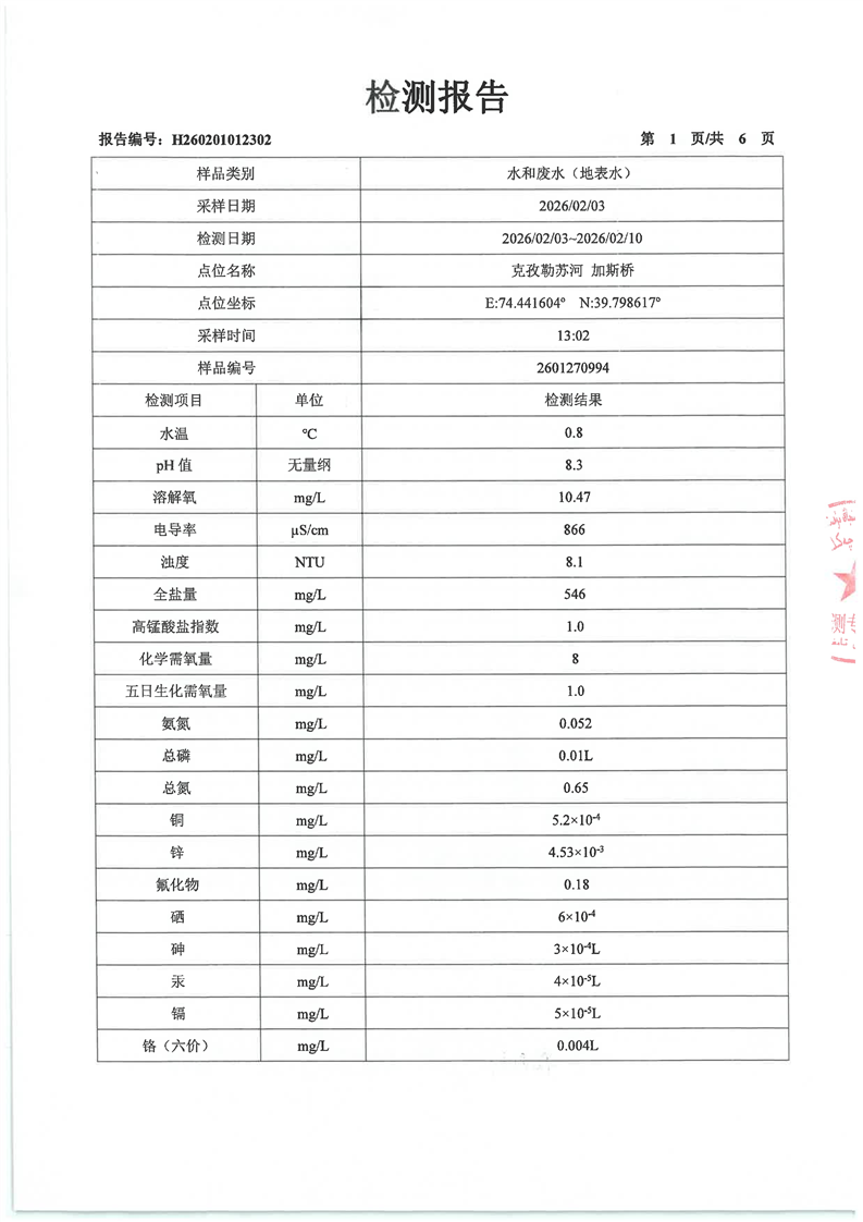 克孜勒苏河加斯大桥2026年2月水质检测报告