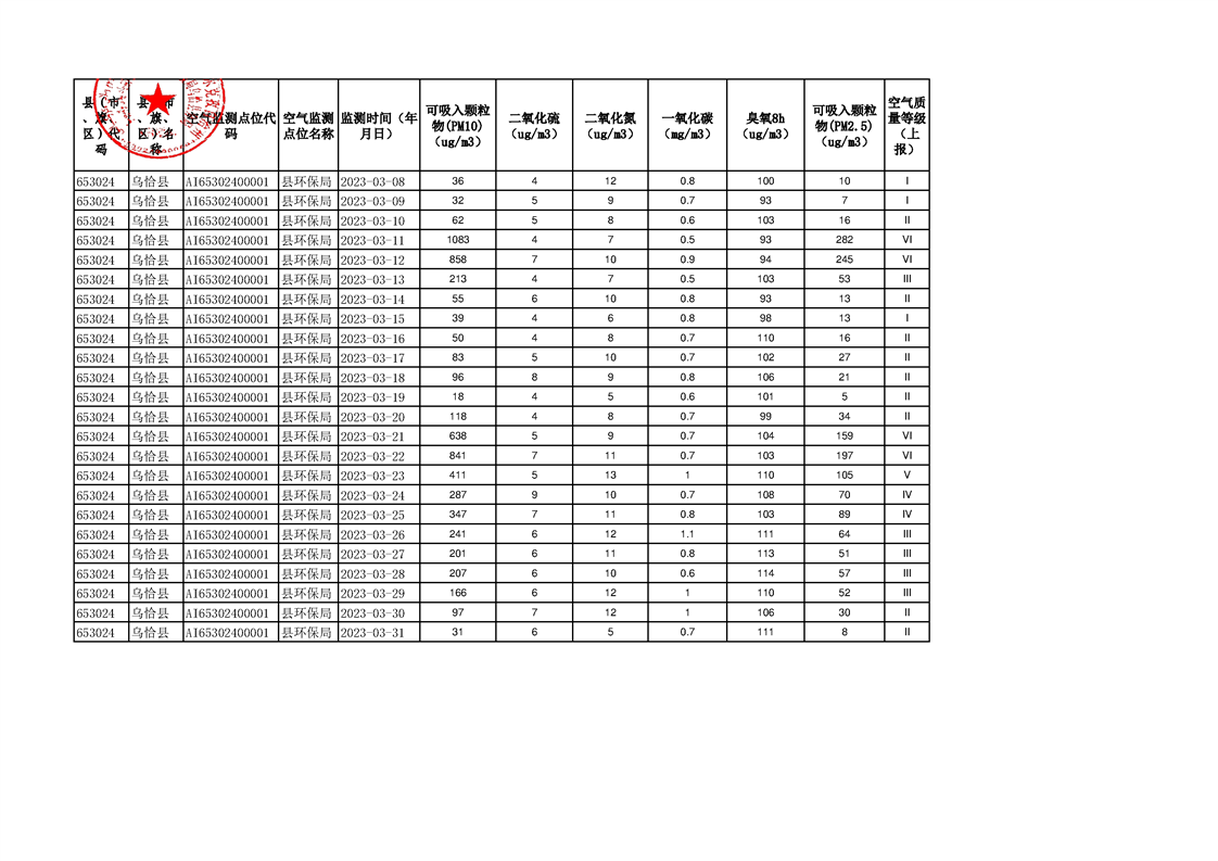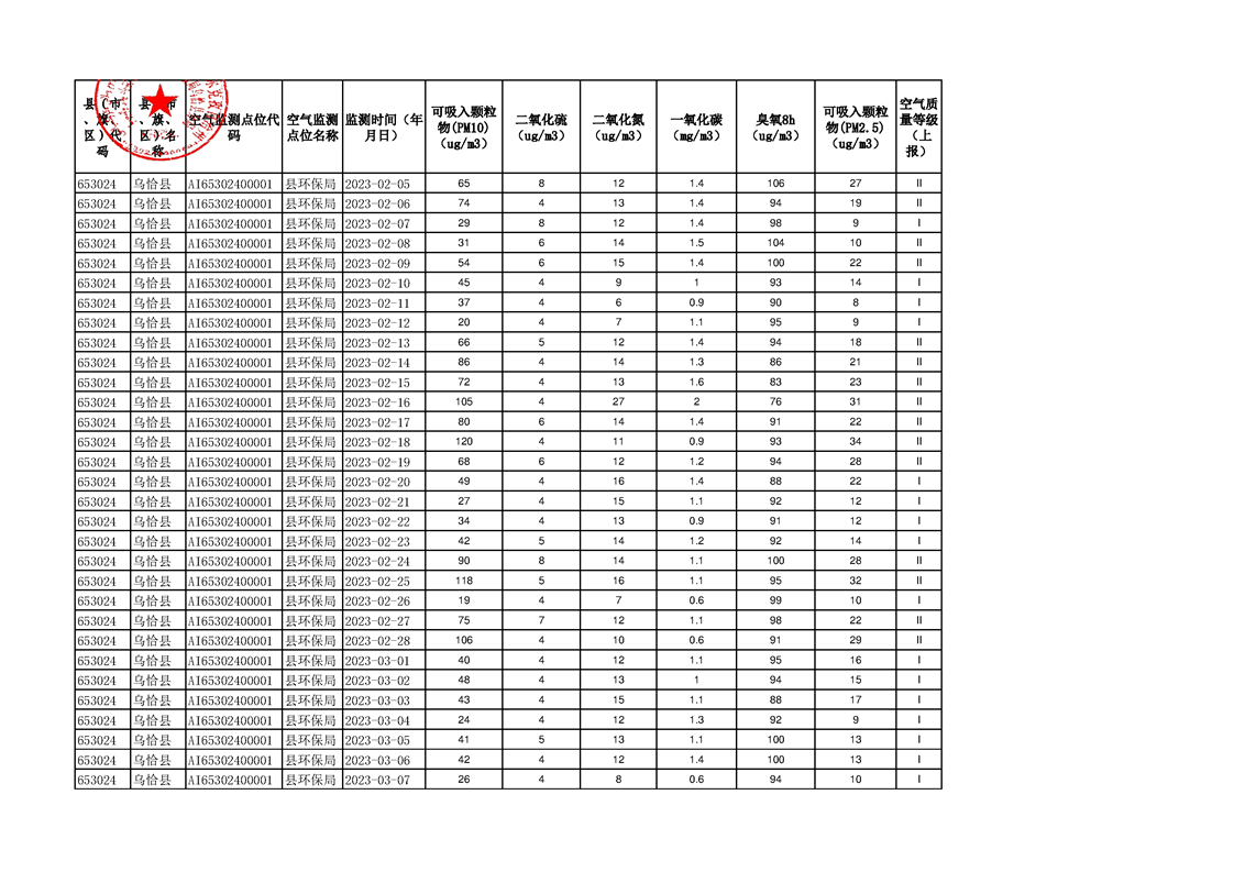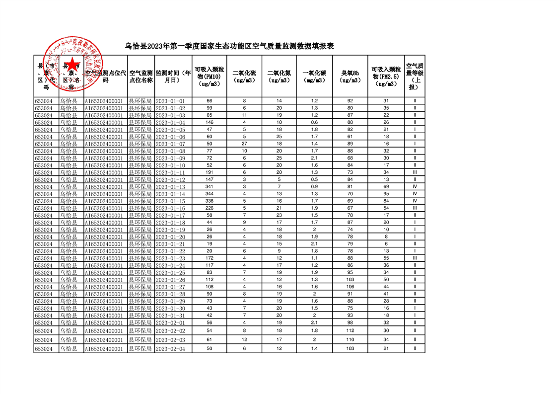 乌恰县2023年第一季度国家生态功能区空气质量监测数据填报表