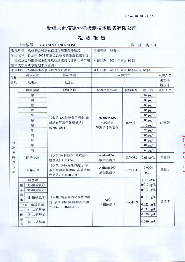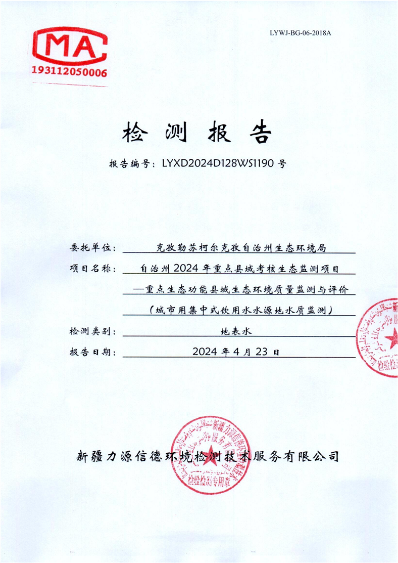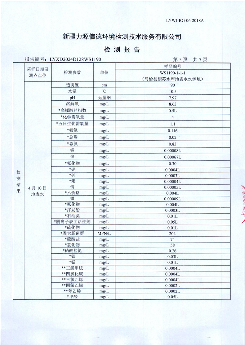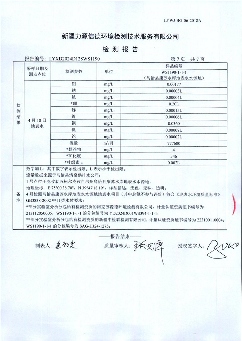 乌恰县康苏水库地表水水源地(2024年第二季度)检测报告