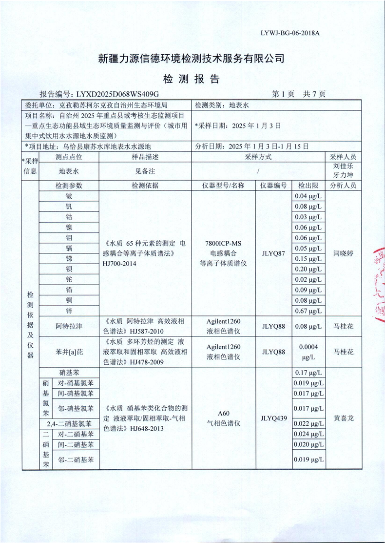 康苏水库地表水水源地第1季度监测报告