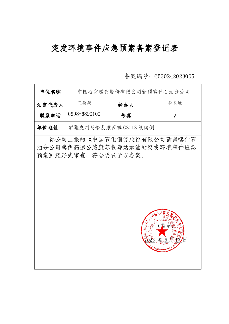 中国石化销售股份有限公司新疆喀什石油分公司突发环境事件应急预案备案登记表