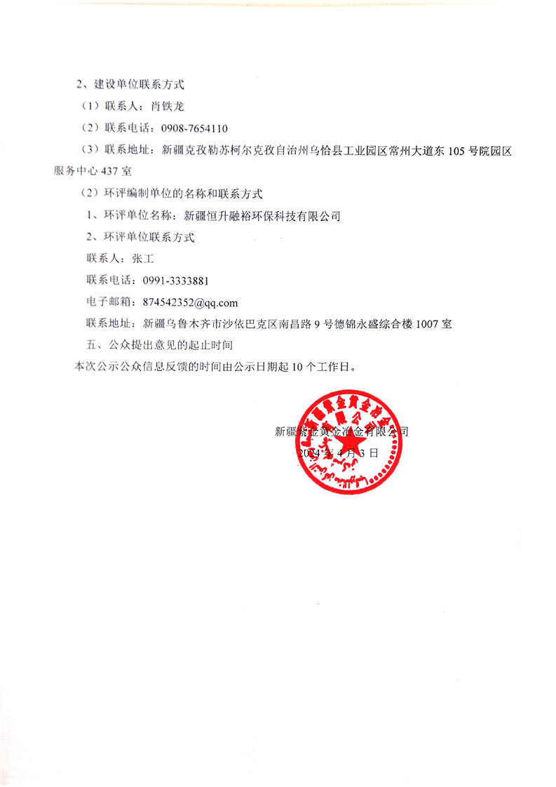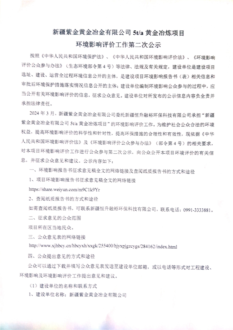 新疆紫金黄金冶金有限公司5t/a黄金冶炼项目环境影响评价工作第二次公示