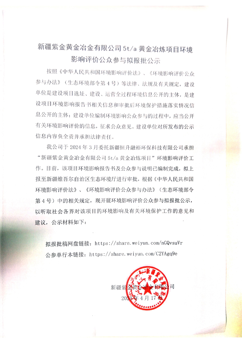 新疆紫金黄金冶金有限公司5ta黄金冶炼项目环境影响报告书报批前公示