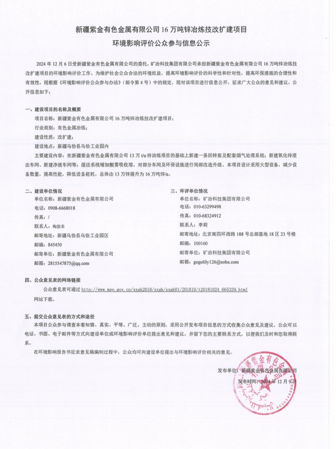 新疆紫金有色金属有限公司16万吨锌冶炼技改扩建项目环境影响评价公众参与信息公示