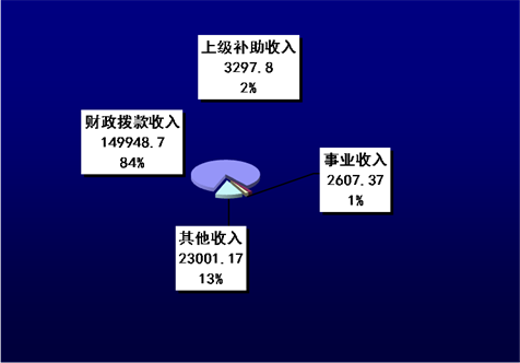 2015年财政总收入178855.04万元,其中财政拨款收入149948.7万元,占本年收入总额的83.84 %;上级补助收入3297.8万元,占本年收入总额的1.84%;事业收入2607.37万元,占本年收入总额的1.45%;其他收入23001.17万元,占本年收入总额的12.86%。