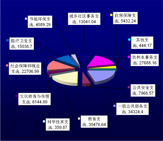 2015年支出总额172134.27万元,其中一般公共服务支出34234.4万元、公共安全支出7968.57万元、教育支出30476.64万元、科学技术支出359.87万元、文化体育与传媒支出6144.89万元、社会保障和就业累计支出22706.99万元、医疗卫生支出15038.7万元、节能环保支出4089.29万元、城乡社区事务支出13041.04万元、农林水事务支出27688.16万元、交通运输1290.28万元、资源勘探电力信息等事务608.16万元、商业服务业等事务497.02万元、金融支出4万元、国土资源气象等事务2109.86万元、住房保障支出5432.24万元、其他支出444.17万元。