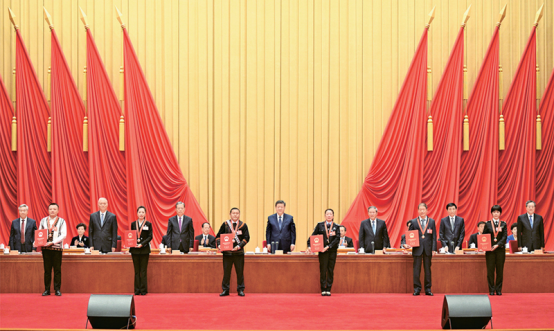 2024年9月27日,全国民族团结进步表彰大会在北京举行。这是习近平等为受表彰的模范个人和模范集体代表颁奖。新华社记者 李学仁/摄