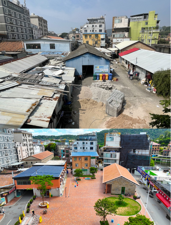 拼版照片:上图为厦门市思明区滨海街道黄厝社区塔头社城中村大广场改造前的景象(资料照片);下图为2024年6月27日拍摄的同一地点改造后的景象(新华社记者周义摄,无人机照片)。新华社发