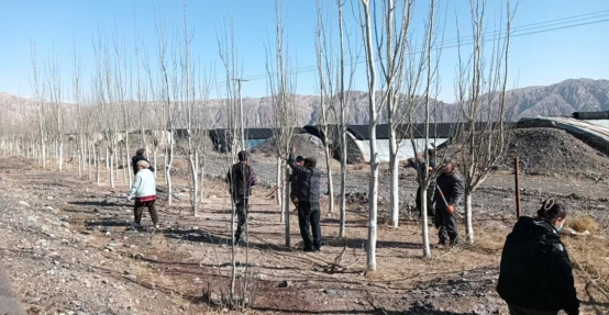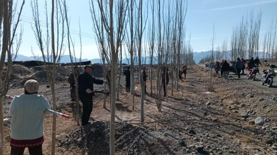 康苏镇乡村振兴基地前身为玛依喀克牧民定居区管理委员会,玛依喀克柯意为“晒得冒油的戈壁滩”。自2006年开发以来,经过19年的不懈努力,基地共种植白杨树291万余株,昔日的戈壁荒滩已变成生态绿洲,农牧民生活水平显著提升。因此,农牧民每年春季都会自发参与树木修剪,珍惜来之不易的幸福生活。