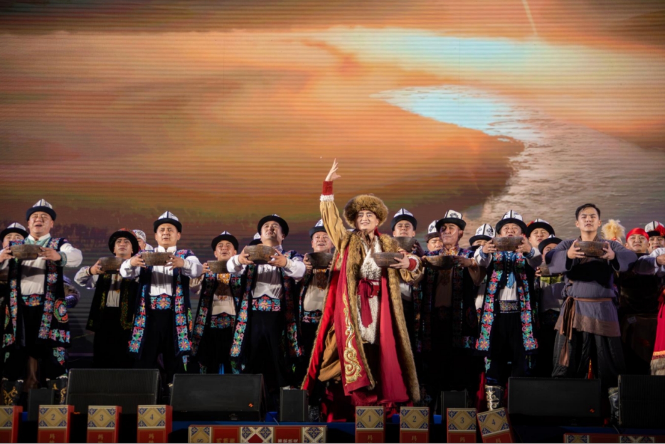大型歌舞表演《丝路嘉年华》中,敦煌飞天的轻盈身影与身着各族华服的舞蹈演员交相辉映,她们或舒展水袖如流云漫卷,或踏节旋转似繁花绽放,在驼铃声与悠扬乐声中勾勒出丝绸之路的千年繁华,将多元文化的交融之美演绎得淋漓尽致;歌曲串烧——《天境乌恰》《斯木哈纳的夕阳》《阿合奇的味道》《爱上帕米尔的那一刻》《奇妙阿图什》将克州的多元和璀璨尽数呈现;北京开国将军后代合唱团带来的表演更是令人动容,从《祖国不会忘记》的深情告白,到《歌唱祖国》的豪迈誓言,这是血脉与山河的共鸣,是传承与守望的对话。开幕式尾声,无人机编队上演的灯光秀带给观众强烈的视觉冲击,璀璨的烟火随着演员和观众的大合唱绚丽绽放,把现场氛围推向最高潮。