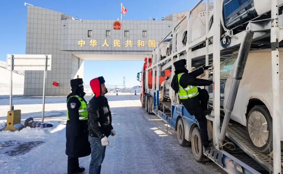吐尔尕特出入境边防检查站执勤民警正在国门查验出口商品车。