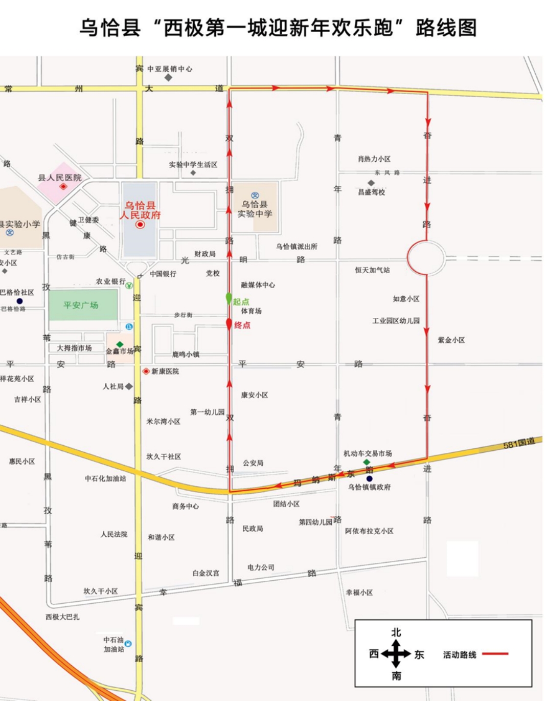 (一)西极第一城迎新年欢乐跑路线:双拥路体育场门口(起点)——常州大道——奋进路——玛纳斯东路——双拥路——双拥路体育场门口(终点)。