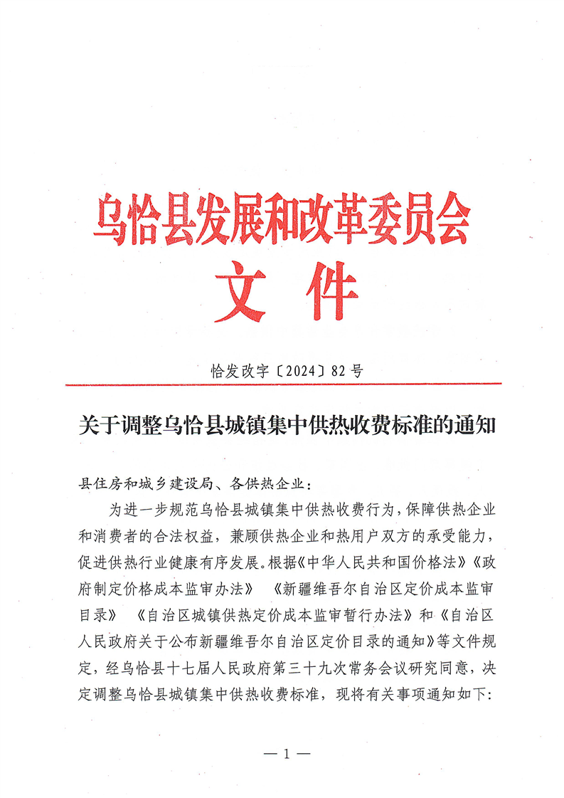 《关于调整乌恰县城镇集中供热收费标准的通知》