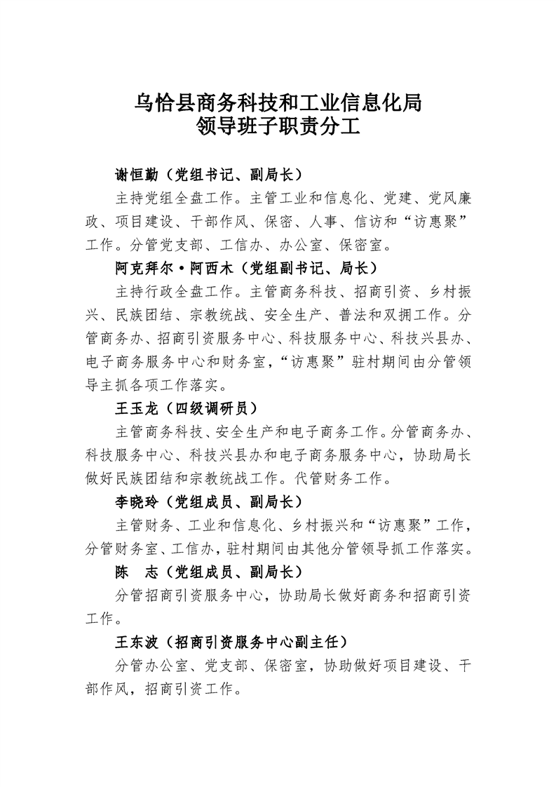 乌恰县商务科技和工业信息化局2022年领导班子职责分工