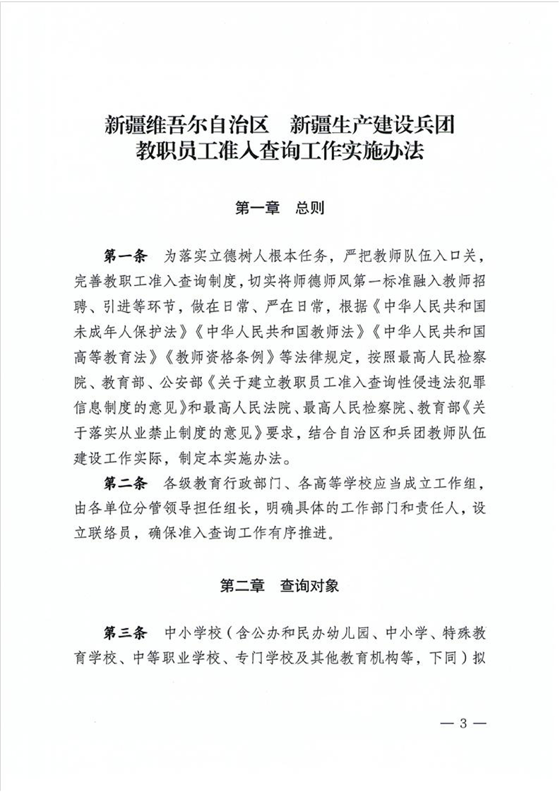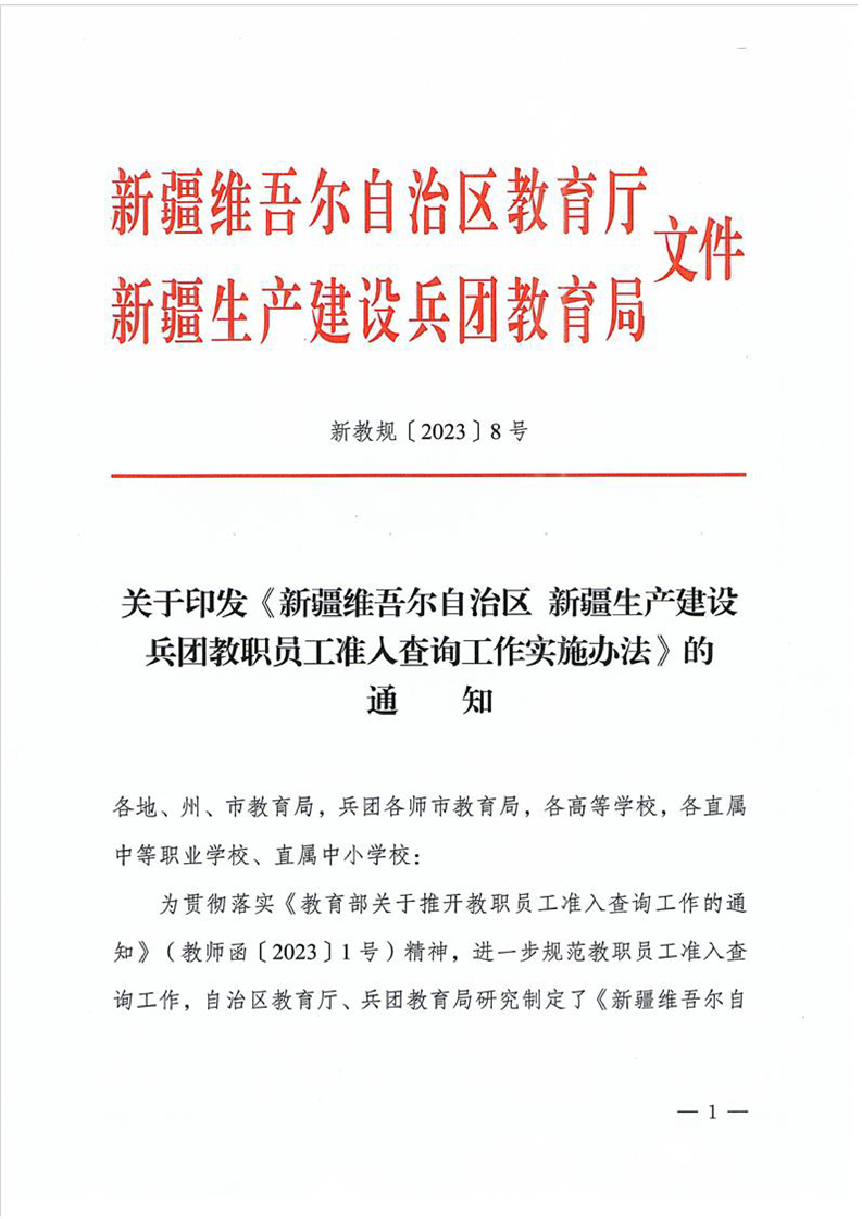 关于印发《新疆维吾尔自治区 新疆生产建设兵团 教职员工准入查询工作实施办法》的通知
