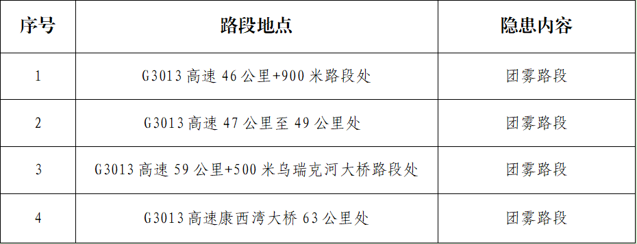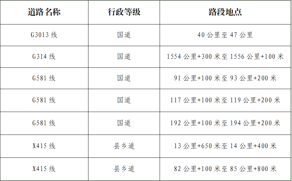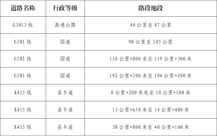 高速G3013:64公里+100米至64公里+600米处路段处将迎来人流车流高峰,极易引发区域性、时段性拥堵。城区:迎宾路、双拥路、天合路、平安路路段车流量相继增多。国道及其他道路:G581线全线车流量明显增加。