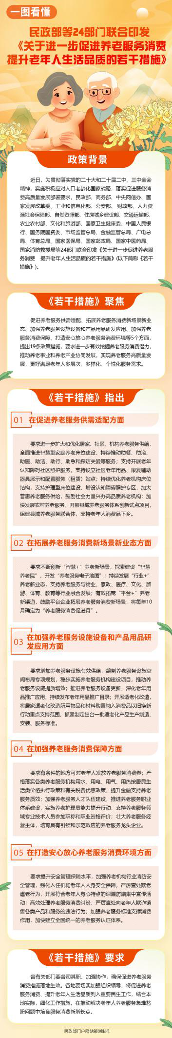 一图看懂民政部等24部门联合印发《关于进一步促进养老服务消费 提升老年人生活品质的若干措施》