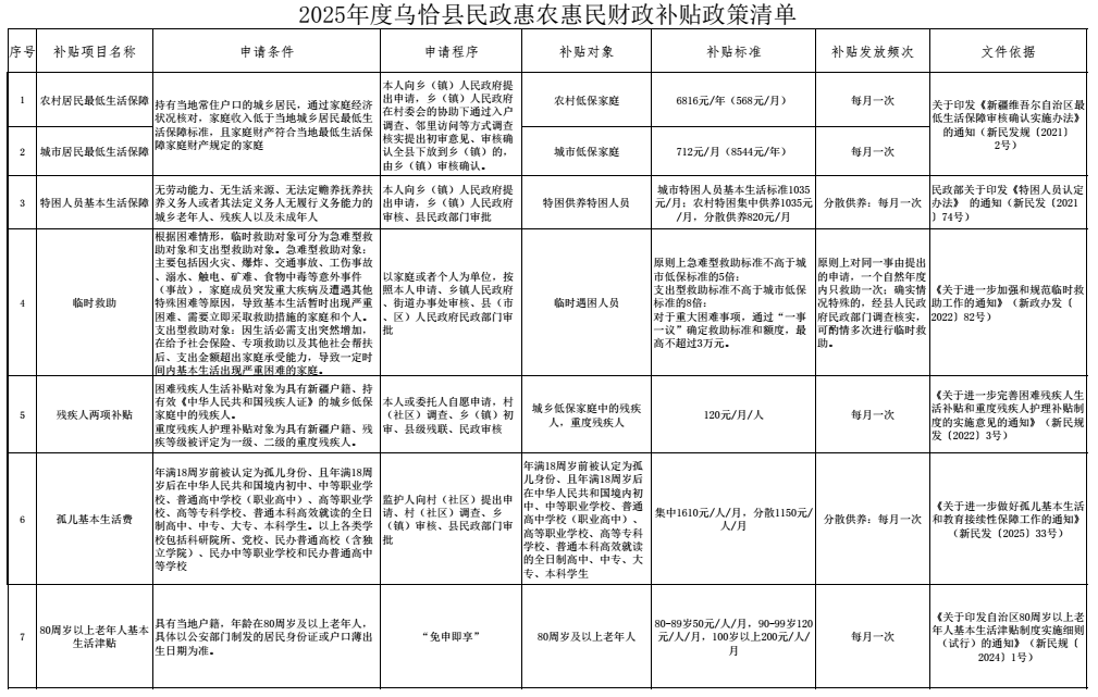 2025年度乌恰县民政惠农惠民财政补贴政策清单