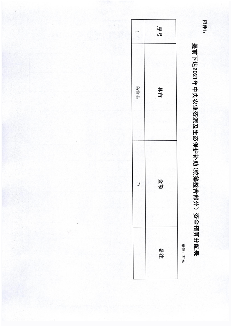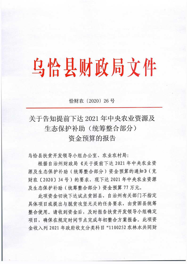 关于告知提前下达2021年中央农业资源及生态保护补助(统筹整合部分)资金预算的报告
