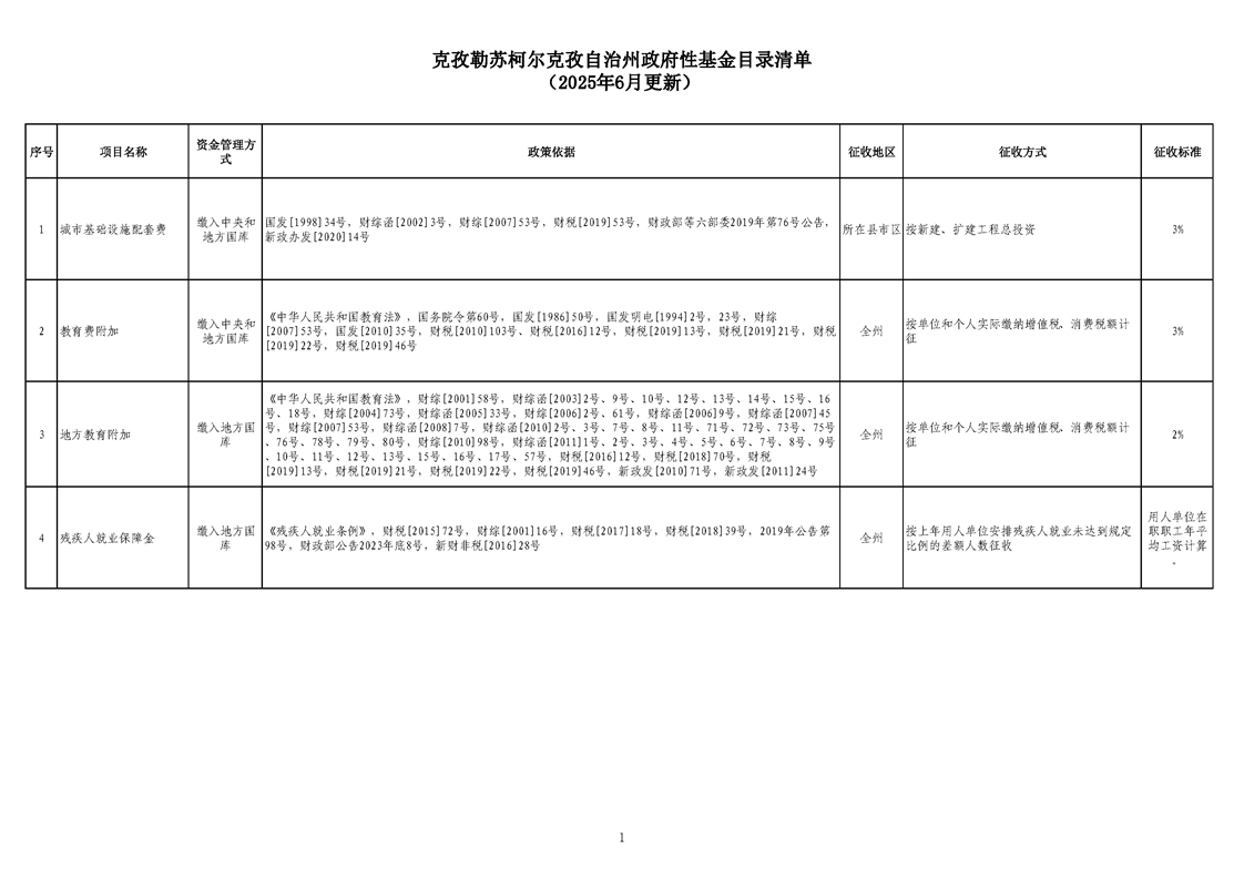 克孜勒苏柯尔克孜自治州政府性基金目录清单