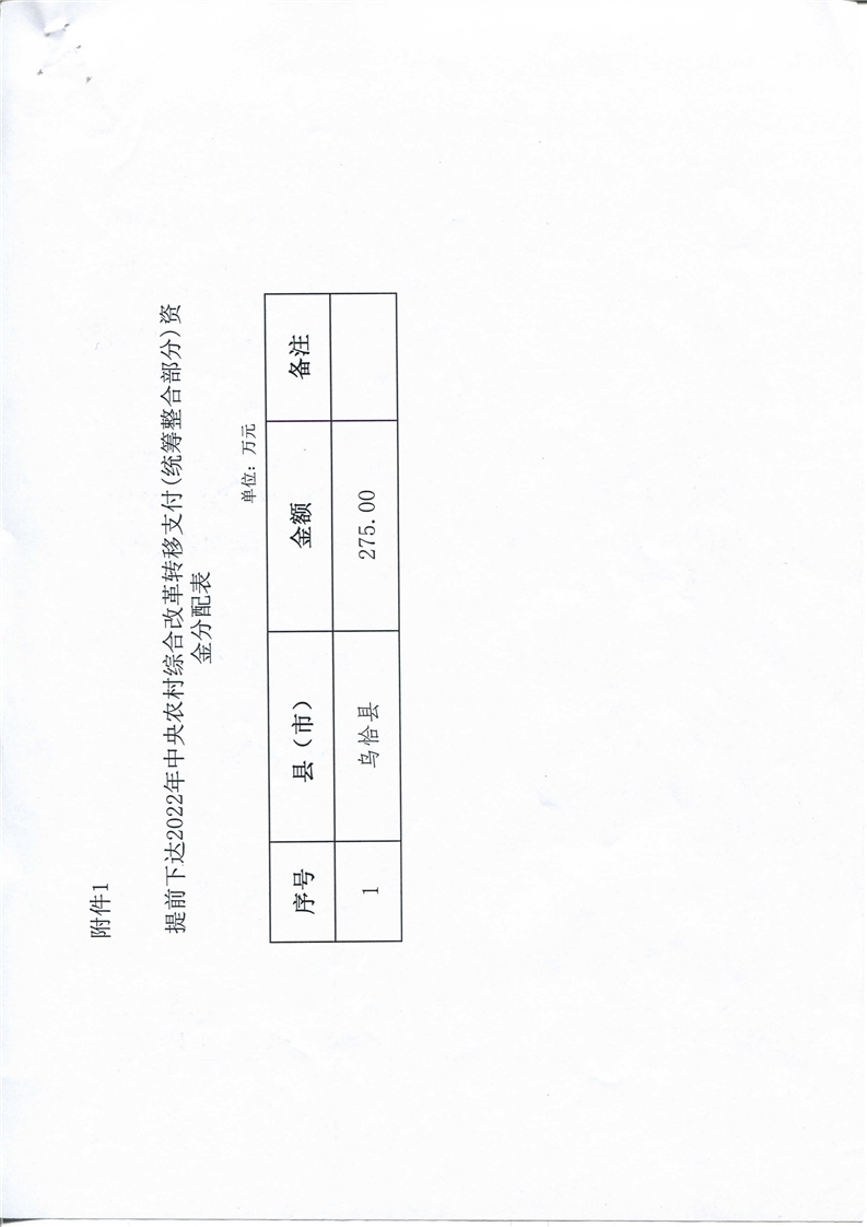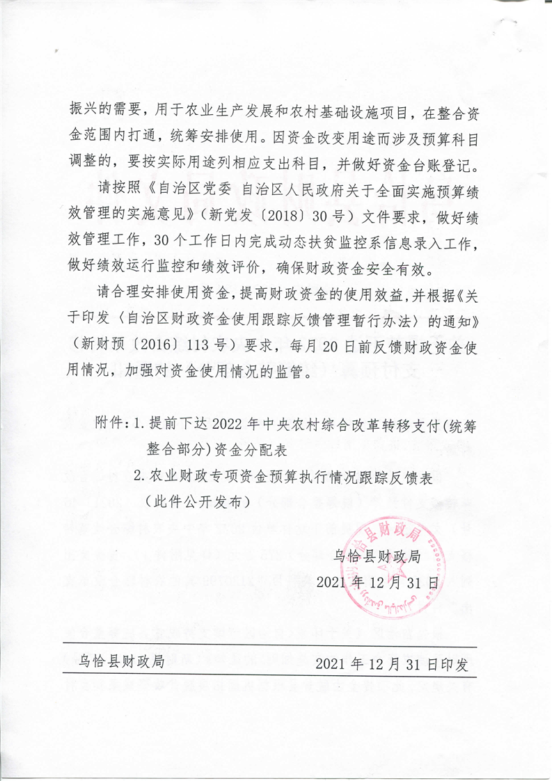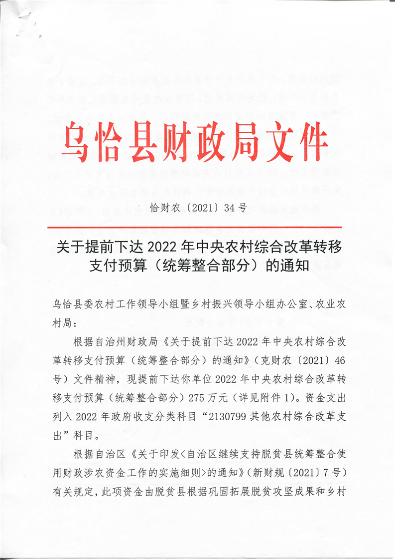 关于提前下达2022年中央农村综合改革转移支付预算(统筹整合部分)的通知