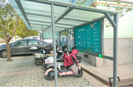 乌恰县和谐小区看到这里的一处电动车充电棚已搭建完成,工人们正在忙着梳理电线,测试电路,加快安装共享充电桩。