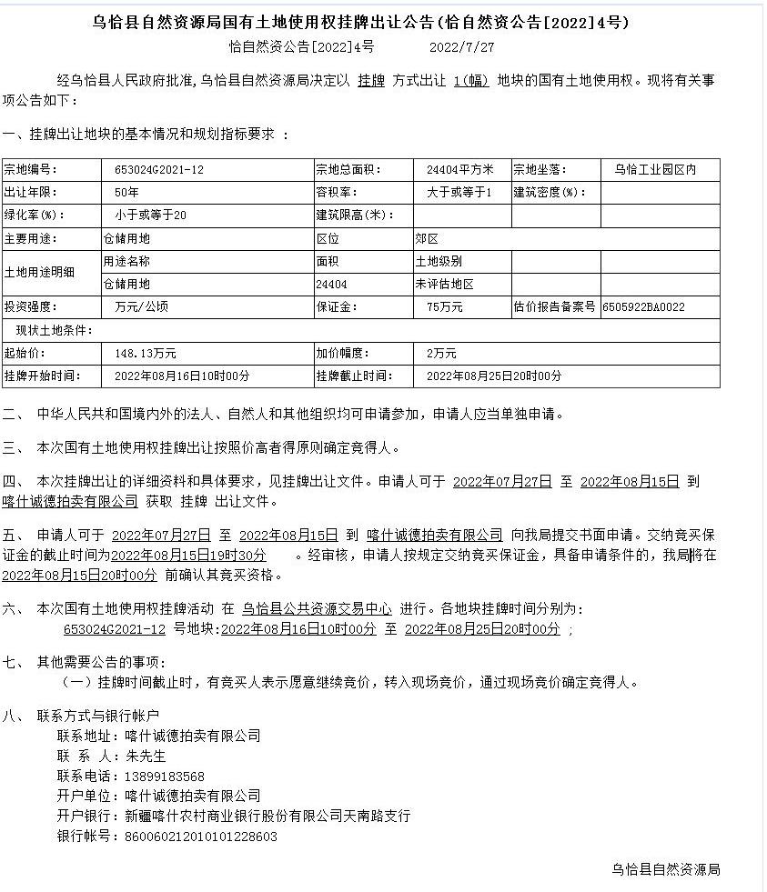 乌恰县自然资源局国有土地使用权挂牌出让公告