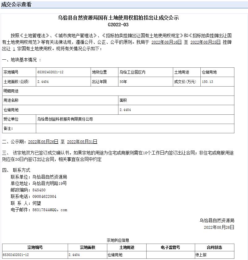 乌恰县自然资源局国有土地使用权招拍挂出让成交公示