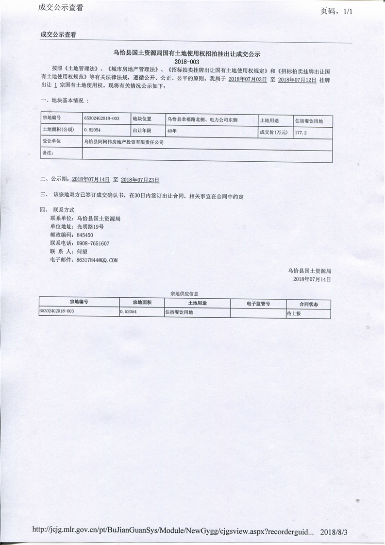 乌恰县国土资源局国有土地使用权招拍挂出让成交公示