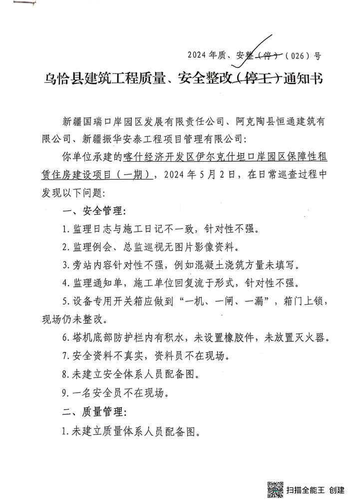 喀什经济开发区伊尔克什坦口岸园区保障性租赁住房建设项目(一期)整改通知书