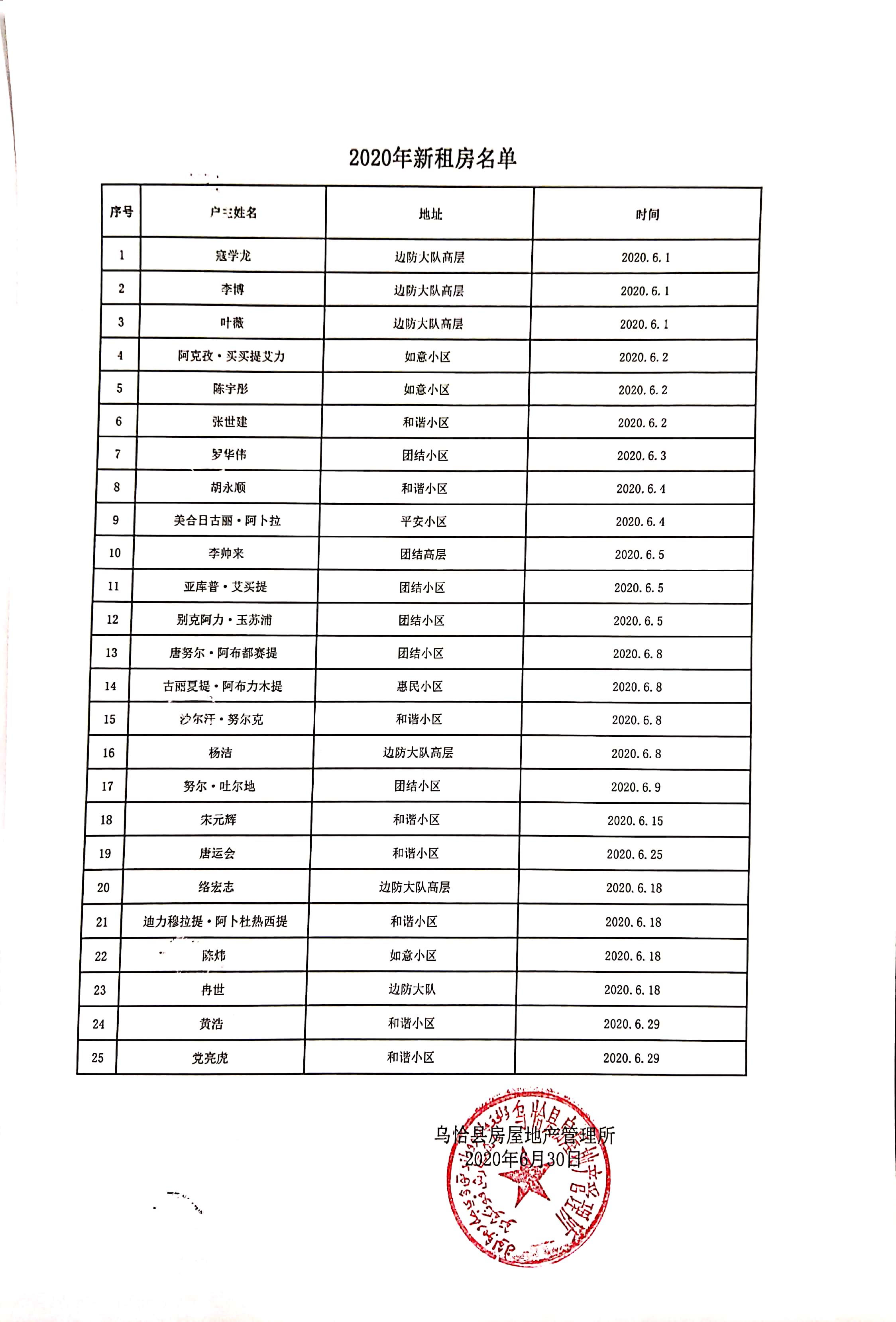 2020年6月份申请公租房人员名单公示