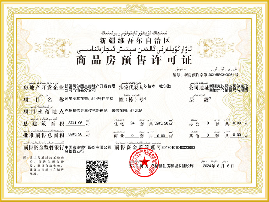 乌恰县阿尔图其花苑小区4号住宅楼商品房预售许可证公示