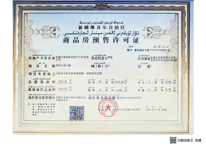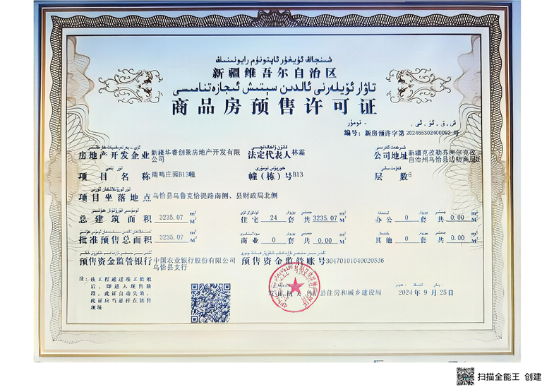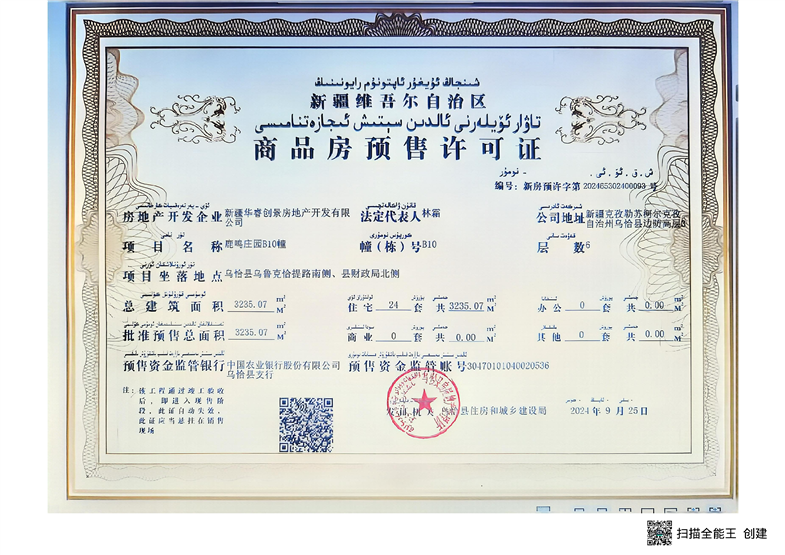 乌恰县鹿鸣庄园A1、B10、B13幢商品房预售许可证