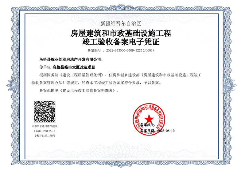 乌恰县裕丰大厦改造项目工程竣工验收备案电子凭证的公示