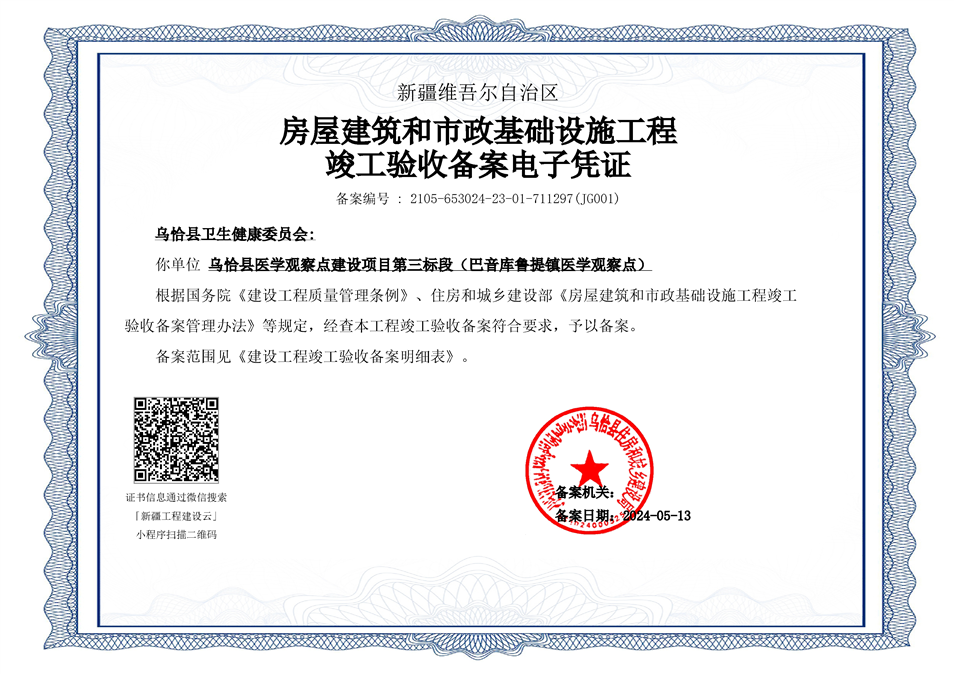 乌恰县医学观察点建设项目第三标段(巴音库鲁提镇医学观察点)竣工验收备案电子凭证