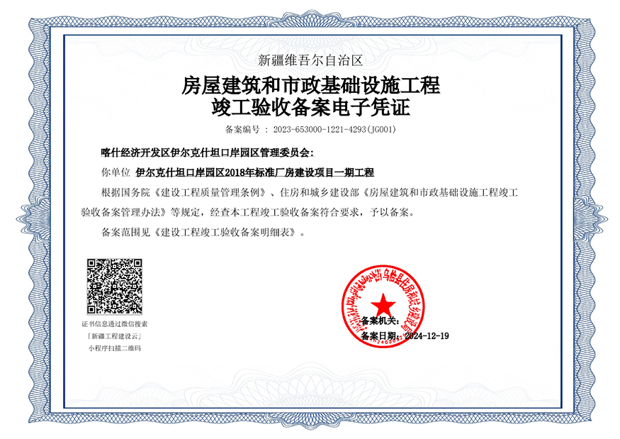 伊尔克什坦口岸园区2018年标准厂房建设项目一期工程项目竣工验收备案电子凭证
