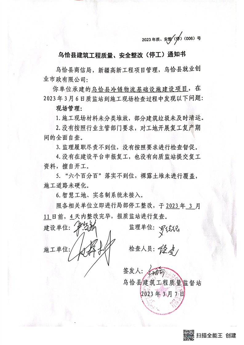 乌恰县建筑工程质量、安全整改(停工)通知书