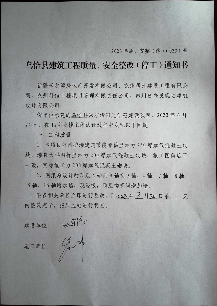 乌恰县建筑工程质量、安全整改(停工)通知书