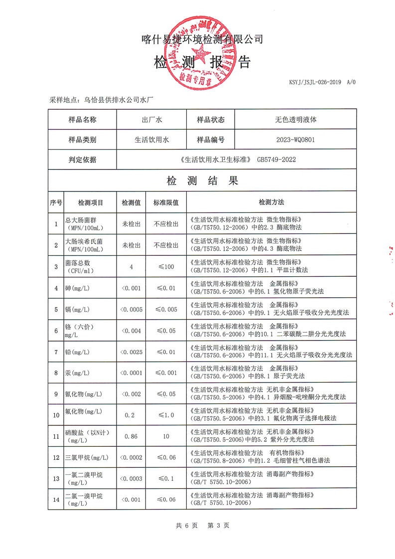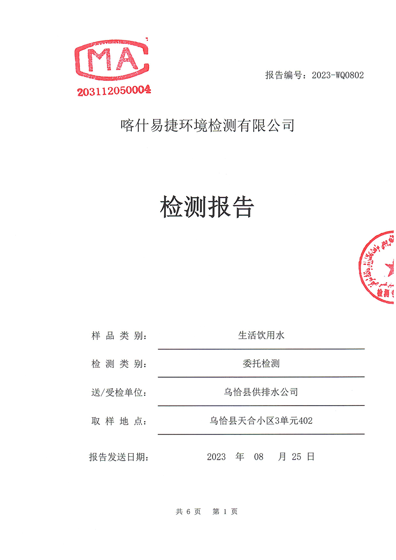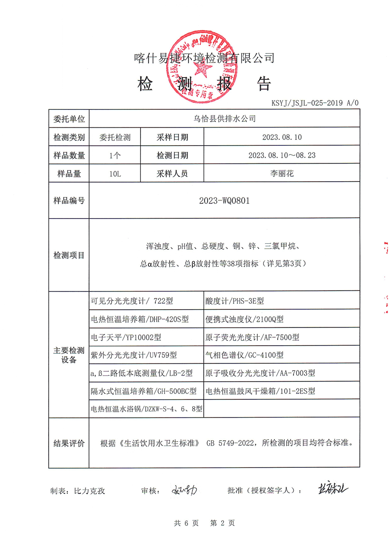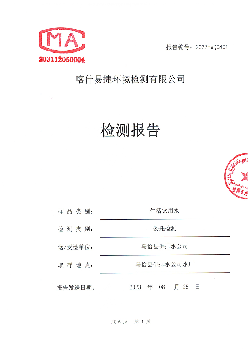 8月份自来水公司检测报告