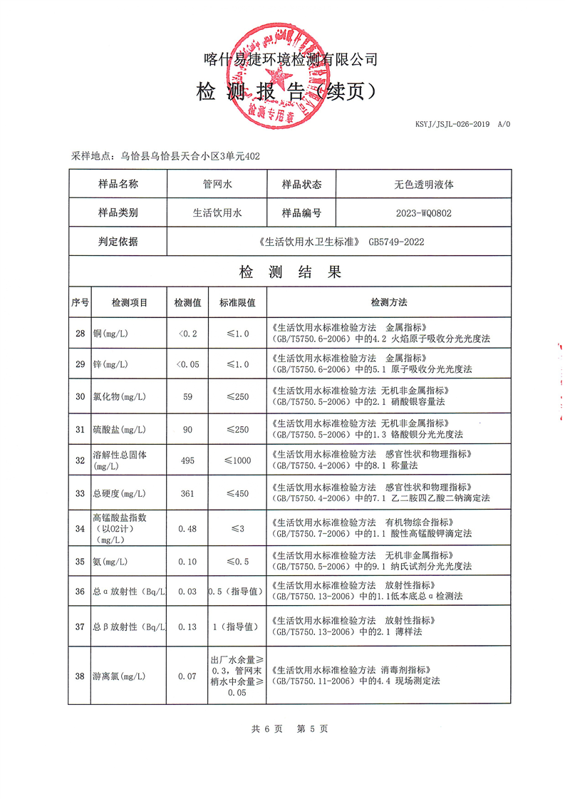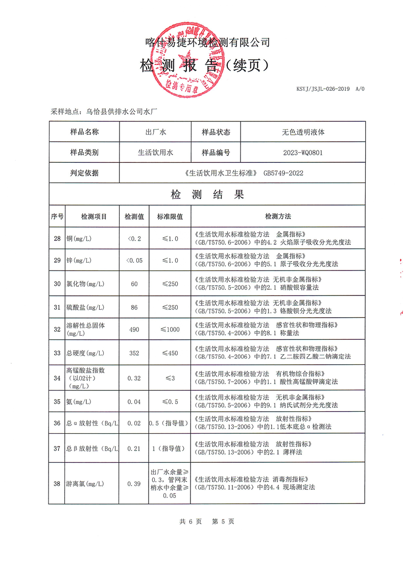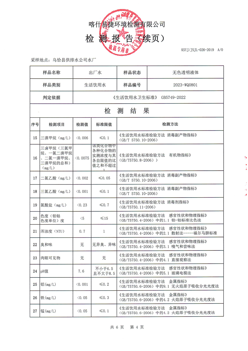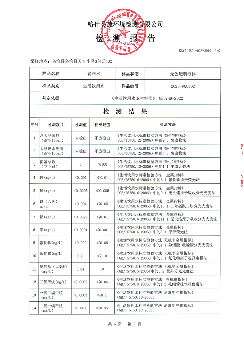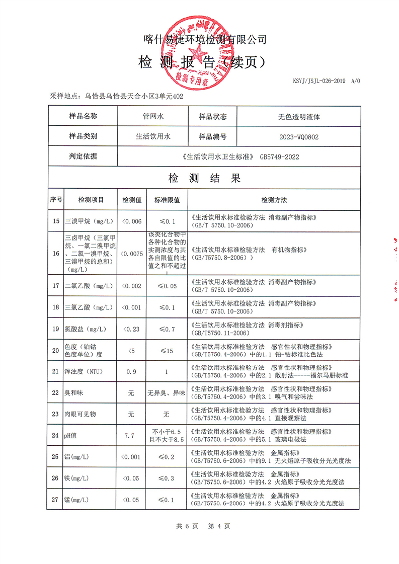 8月份自来水公司检测报告