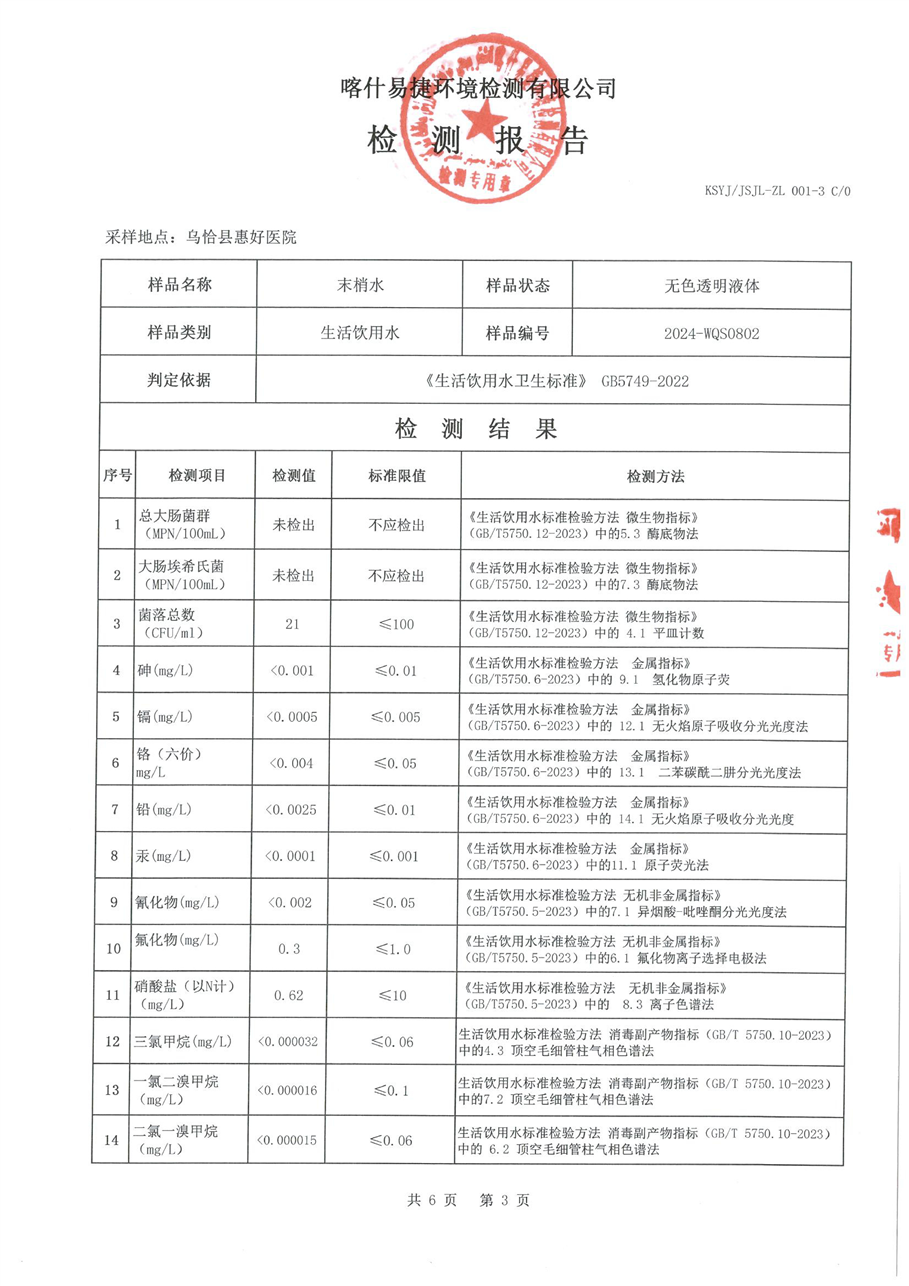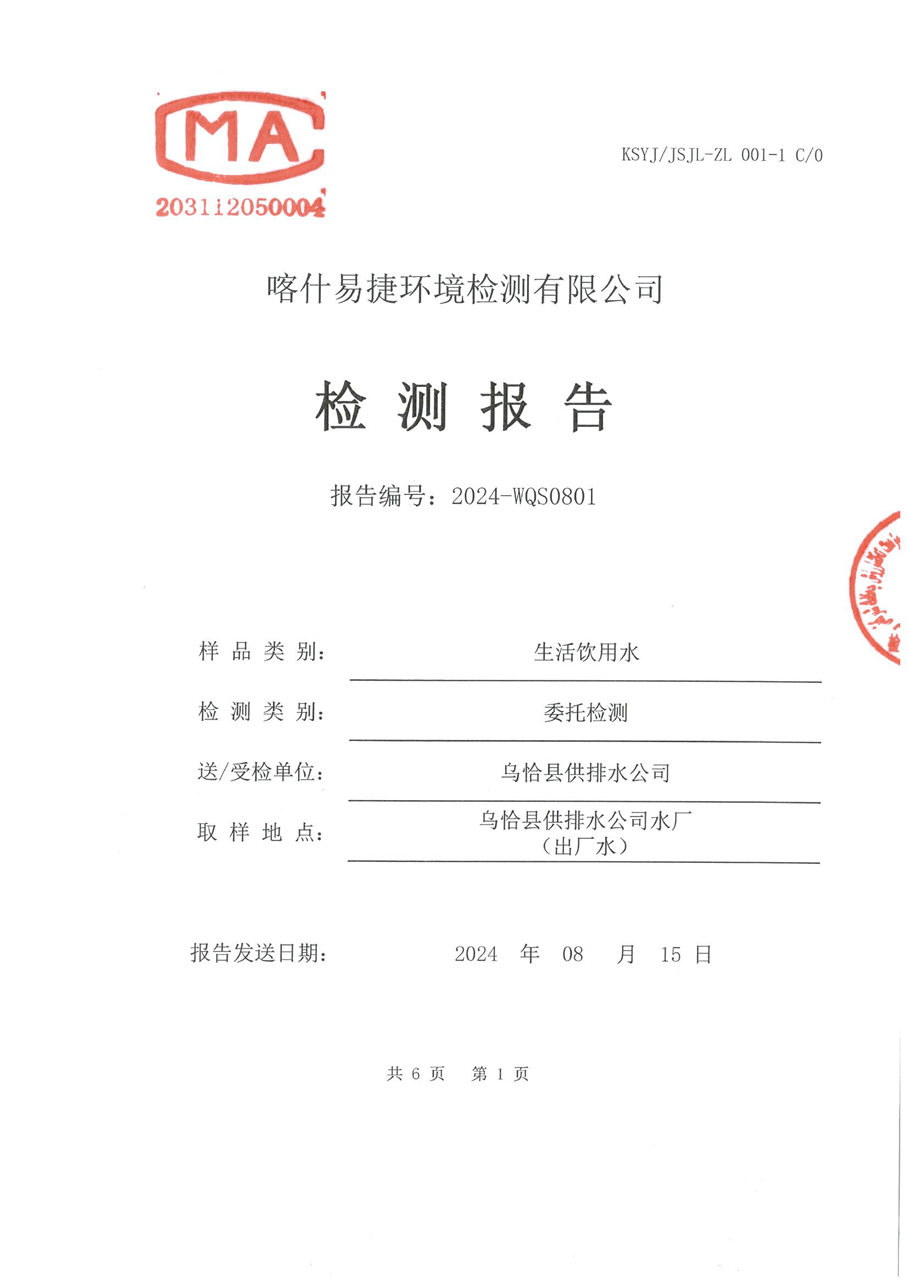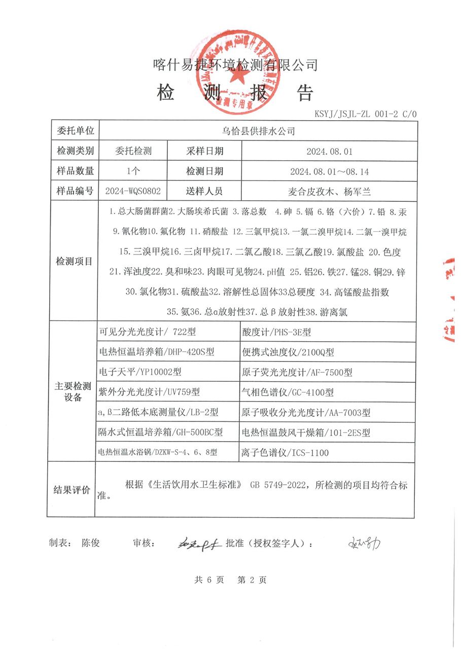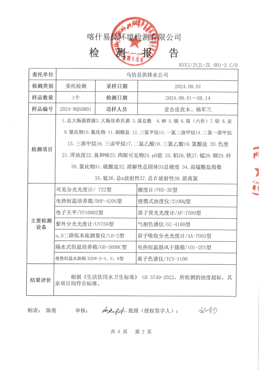 乌恰县8月水质检测报告