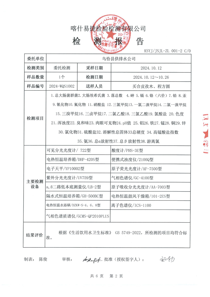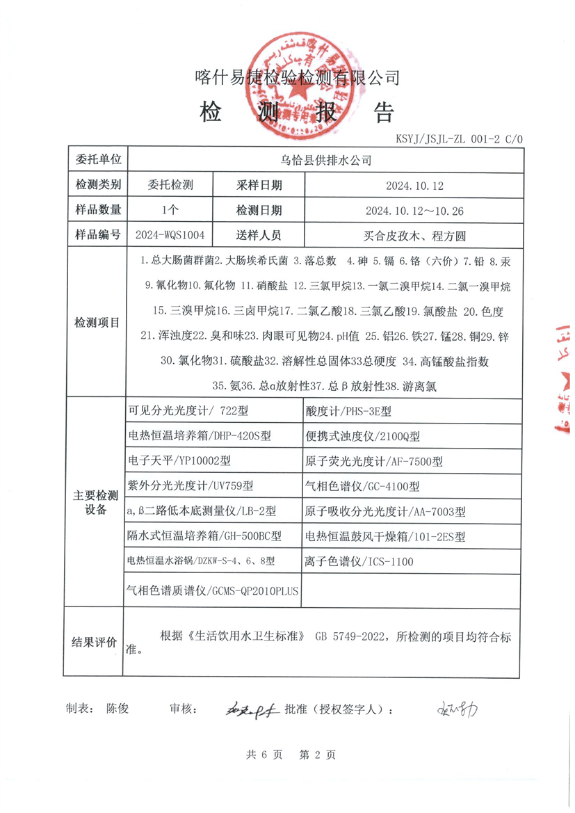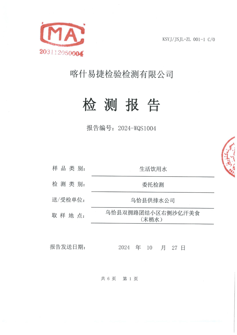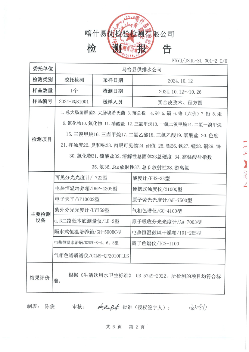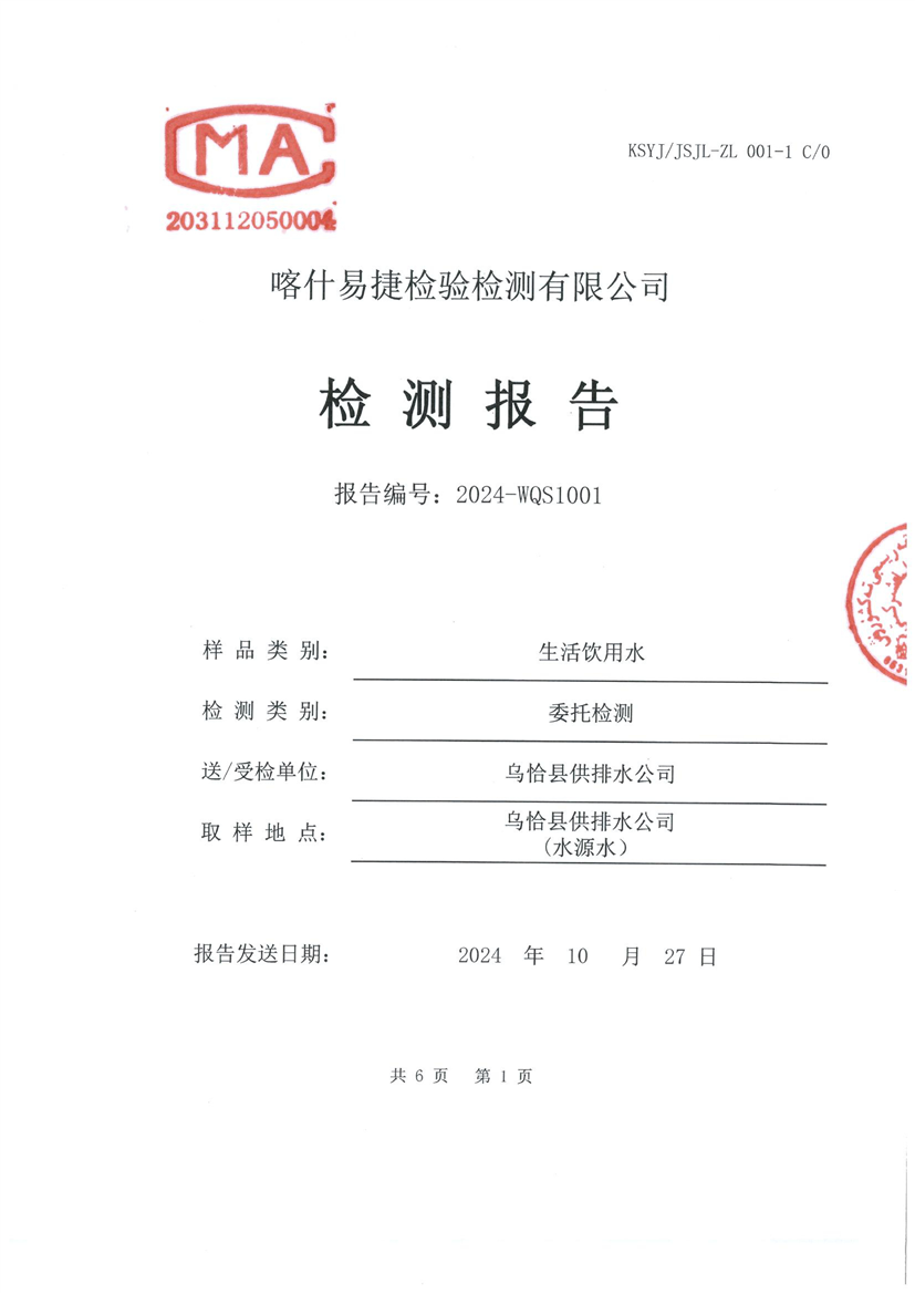 乌恰县10月水质检测报告