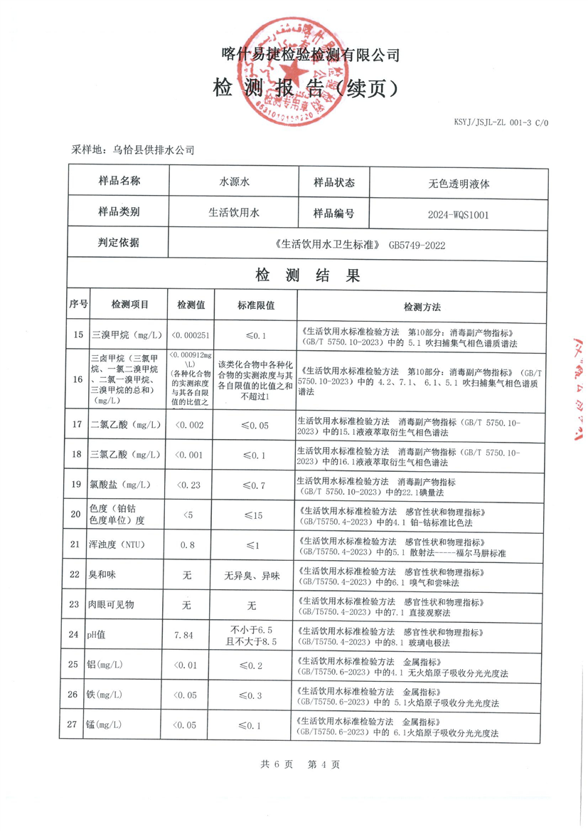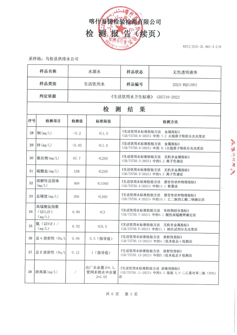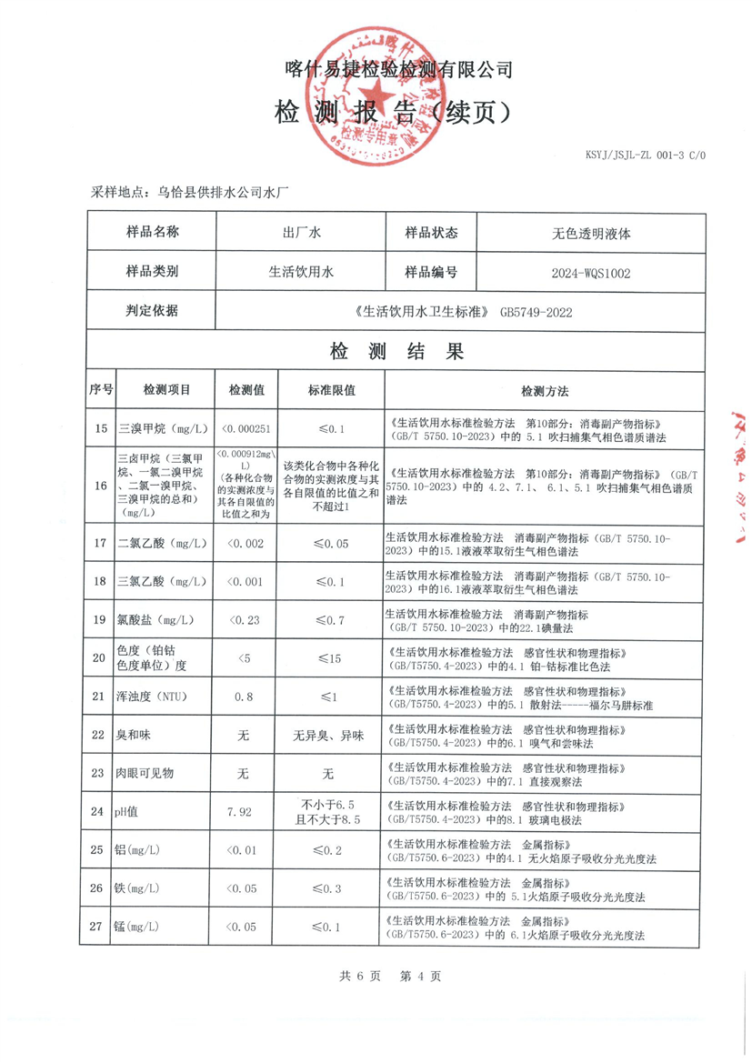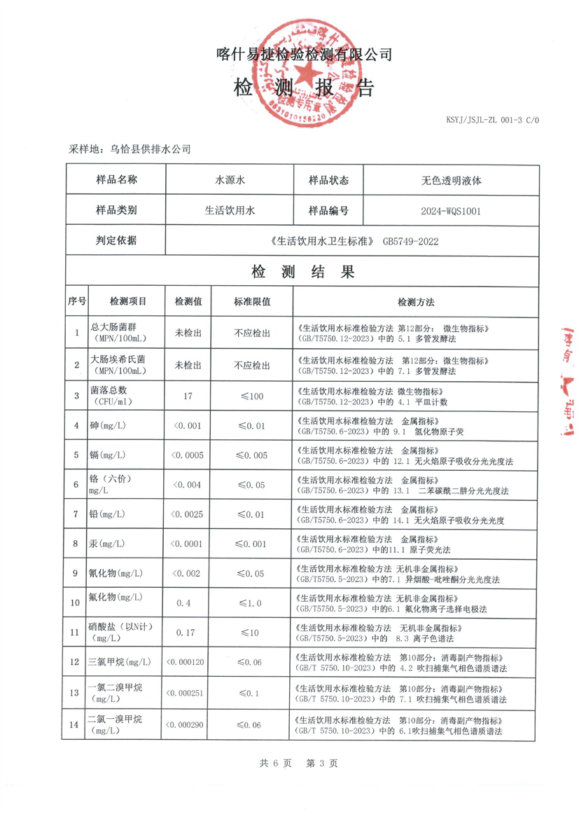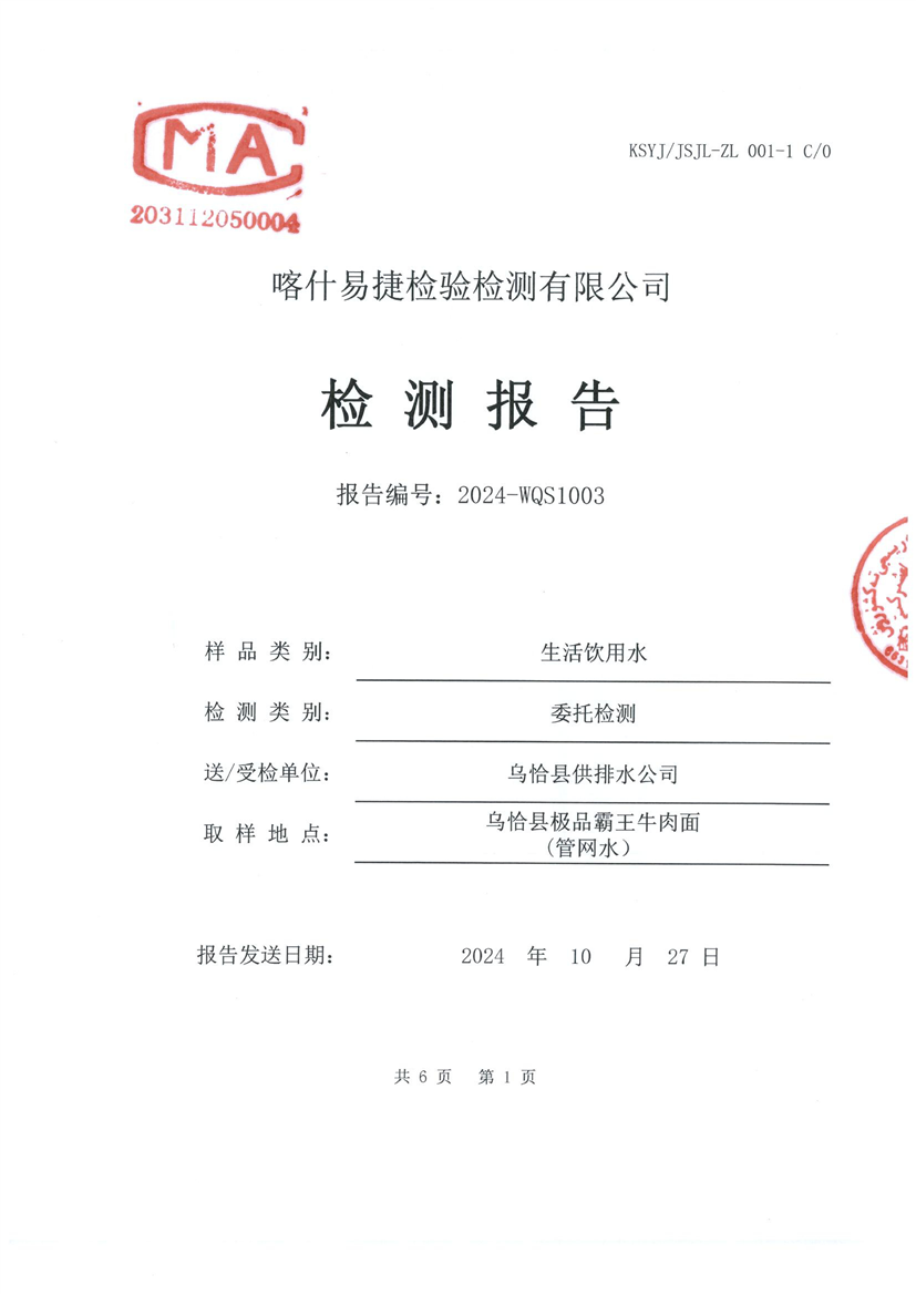 乌恰县10月水质检测报告