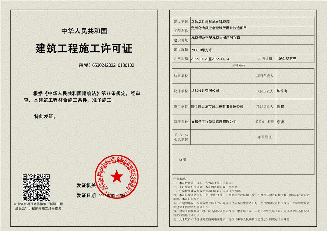 建筑工地施工许可证-克州乌恰县应急避难所提升改造项目