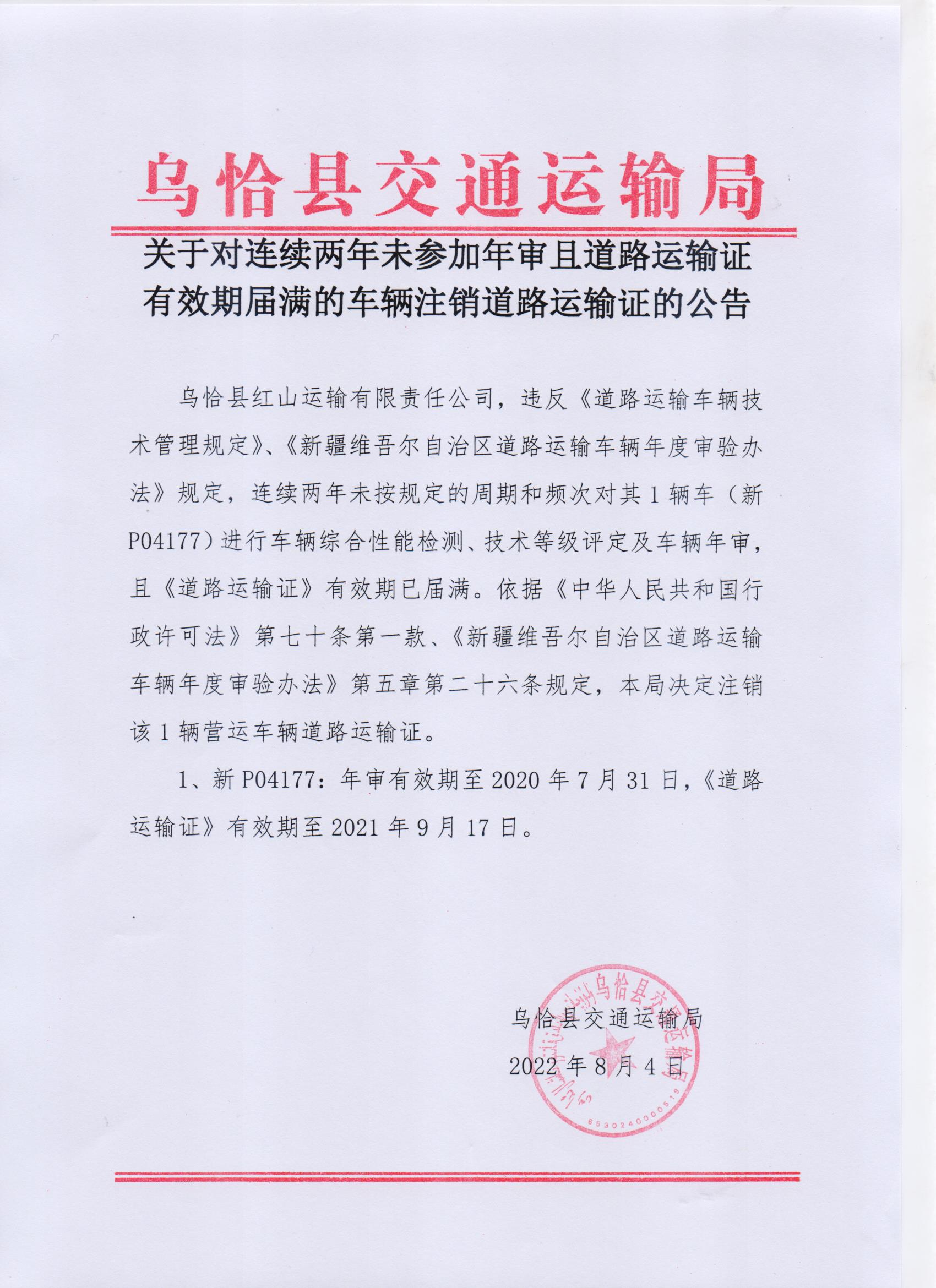 关于对连续两年未参加年审且道路运输证有效期届满的车辆注销道路运输证的公告